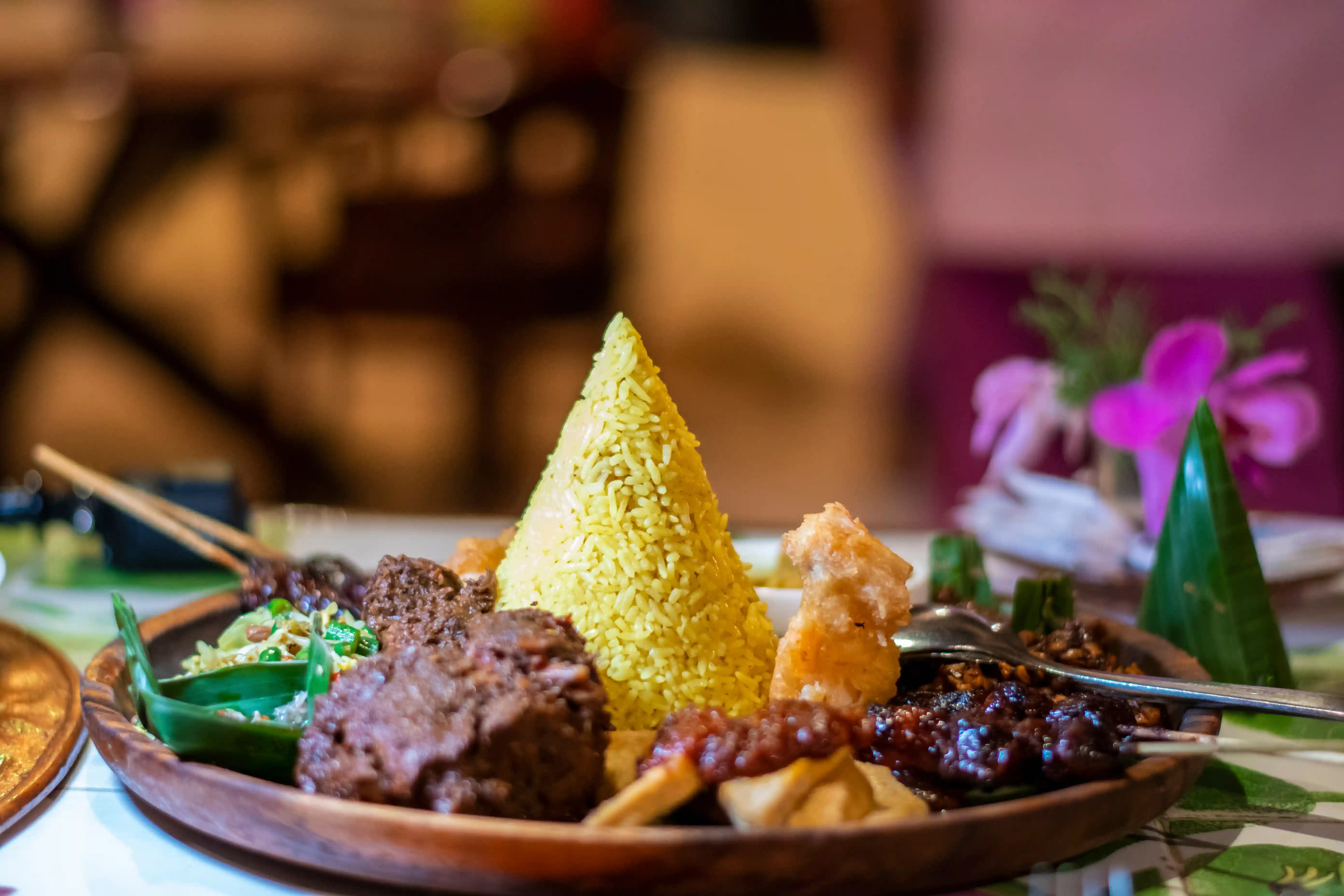 Nasi tumpeng, with its signature cone of turmeric rice, is one of Bali’s most iconic festive dishes, usually shared during cultural celebrations