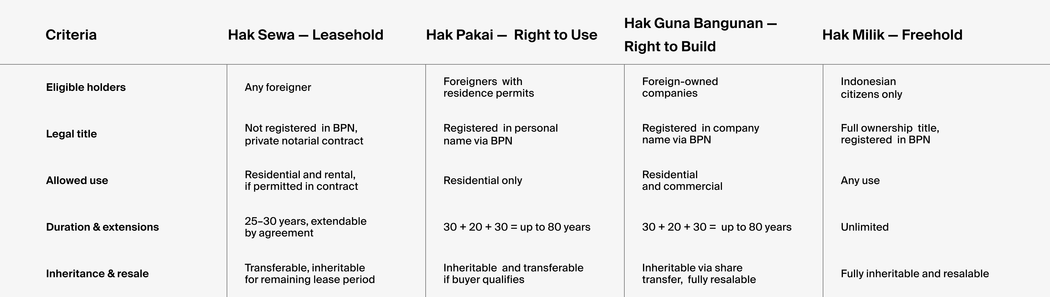 Freehold — Hak Milik. This is full land ownership, comparable to owning property in Europe or the US. However, only Indonesian citizens can hold a freehold title. Even local companies can’t qualify unless 100% Indonesian-owned.