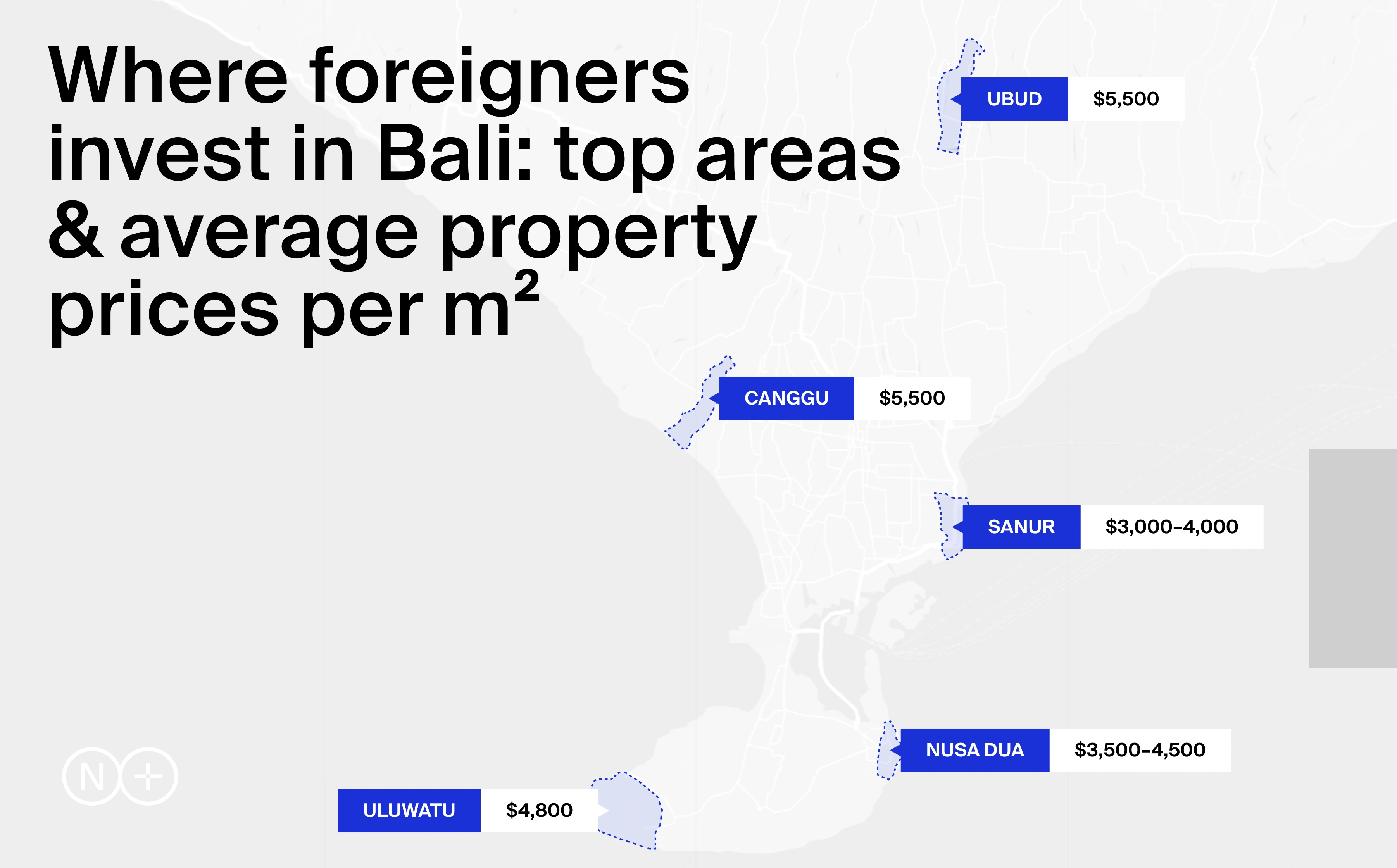 Prices vary widely depending on the area, size and quality. Entry-level properties start around $2,500 per square metre, while premium beachfront villas in areas like Canggu or Seminyak can reach $6,000–10,000 per square metre. On average, a two-bedroom villa in a high-demand location costs between $180,000 and $300,000.