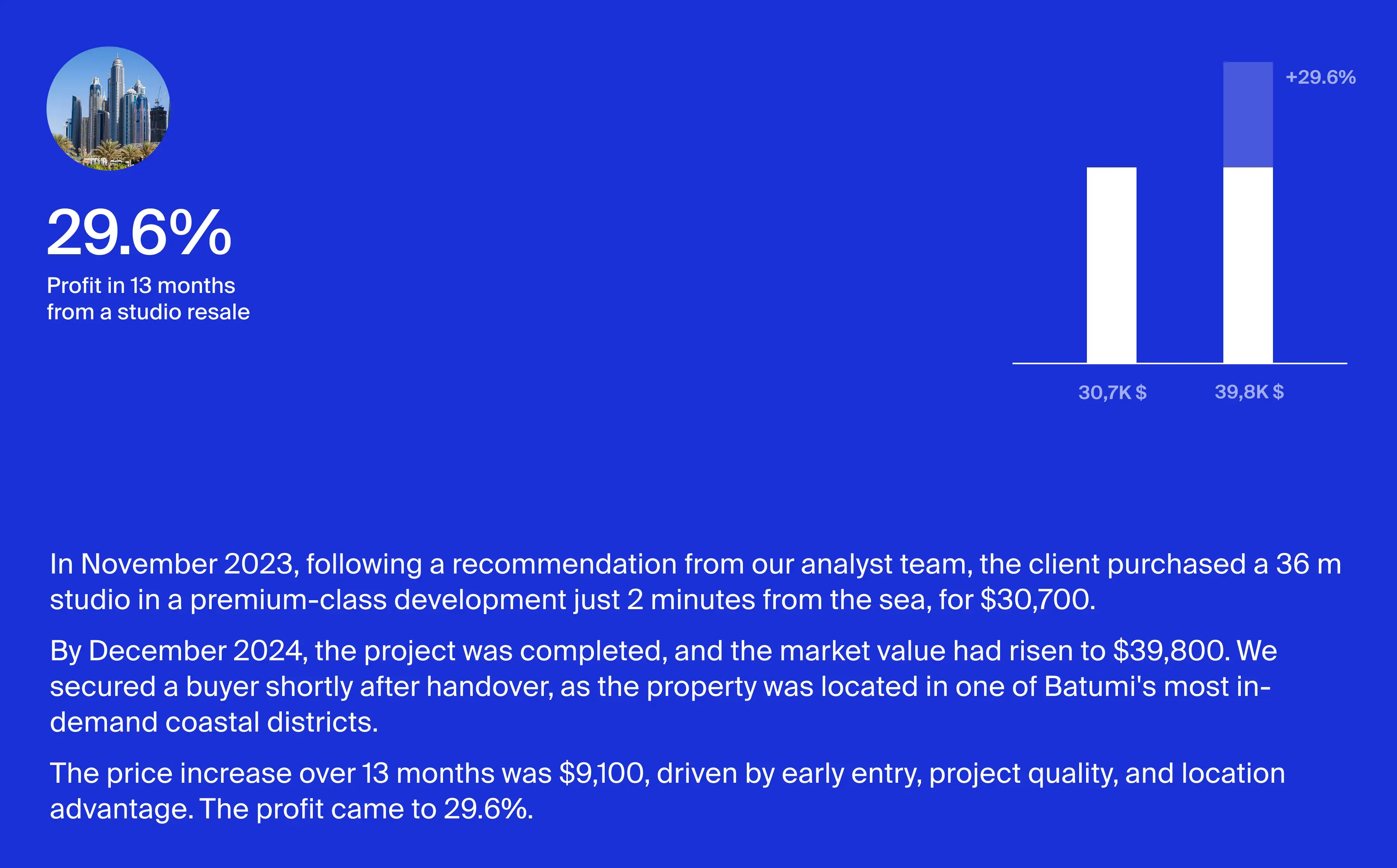 We’re among the first to know about Batumi’s hottest presales — and we help clients secure the best units before public launch. Book a consultation to explore high-yield opportunities.