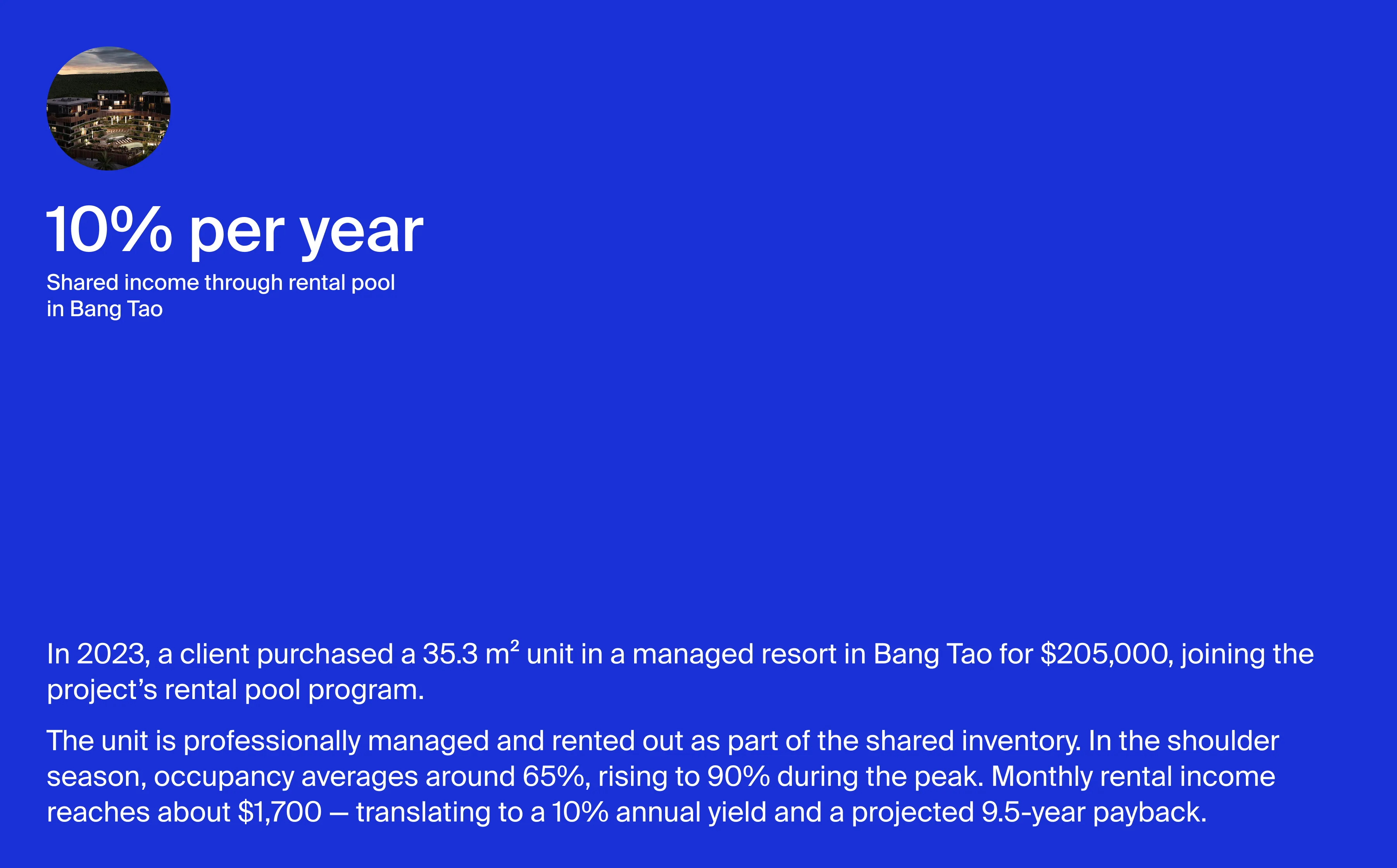Guaranteed-yield vs. rental-pool. Some developers offer fixed returns for the first few years, which gives predictability to your investment in Thailand. Alternatively, rental pools combine the income from similar units and share it among owners, so payouts reflect real occupancy levels.