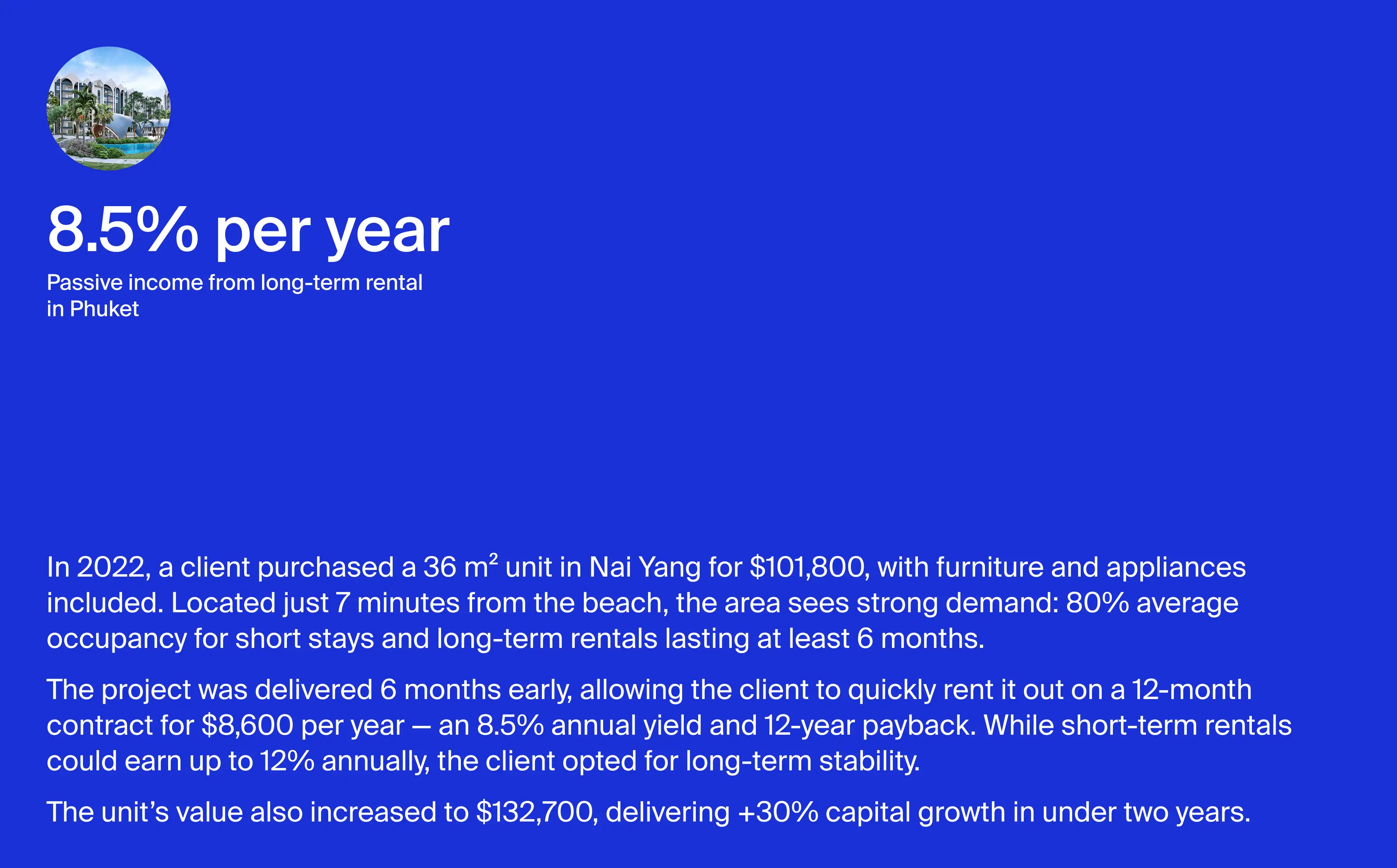 Thailand's property market is booming, especially in Phuket, where property prices can rise up to 15% annually and the return on investment from rentals ranges from 5 to 12%. Foreign investors have diverse opportunities — from fast capital gains to stable passive incomes, or a combination of both.