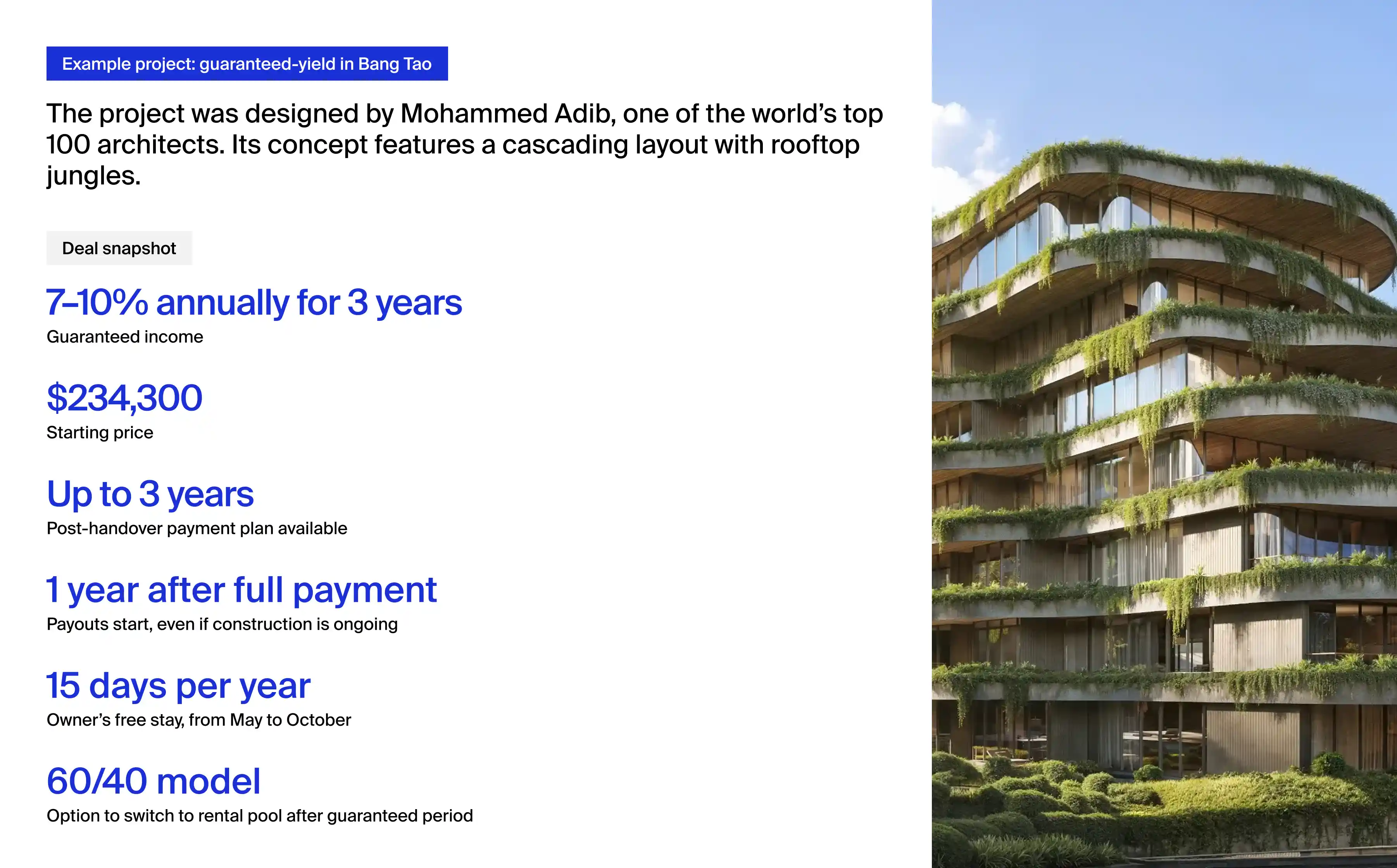 They are real but should be approached with caution. Developers in Phuket often offer 5–7% fixed annual returns for the first 2–5 years. The key is to verify the developer’s track record, financial stability, and contract terms. Reputable operators usually honor guarantees, but they cap your upside and restrict property use.