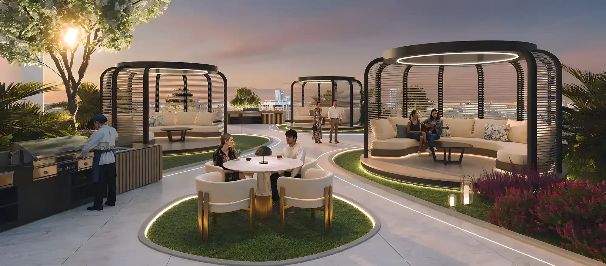 Options include private terraces with views of the water, Dubai Islands Marina, and the Downtown skyline