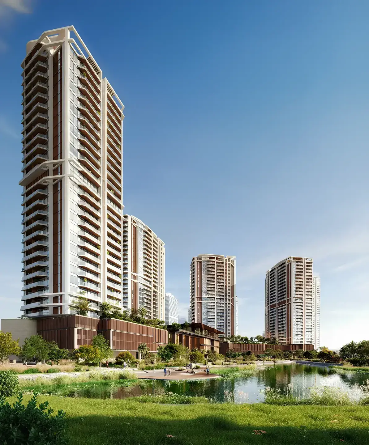 Consists of five 26-story towers featuring apartments, including options with staff rooms, as well as penthouses and commercial premises