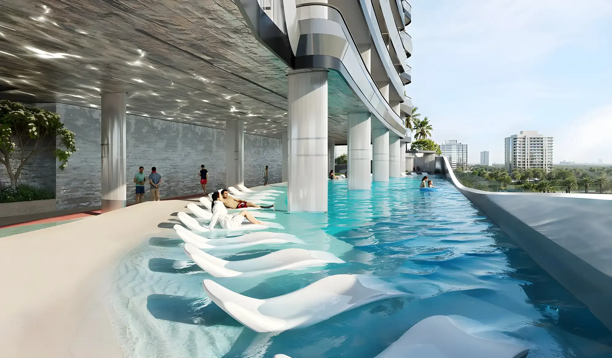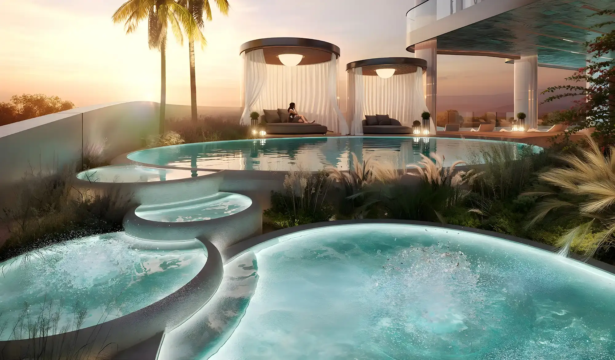 The complex offers a swimming pool, coworking facilities and landscaped grounds for leisurely walks.