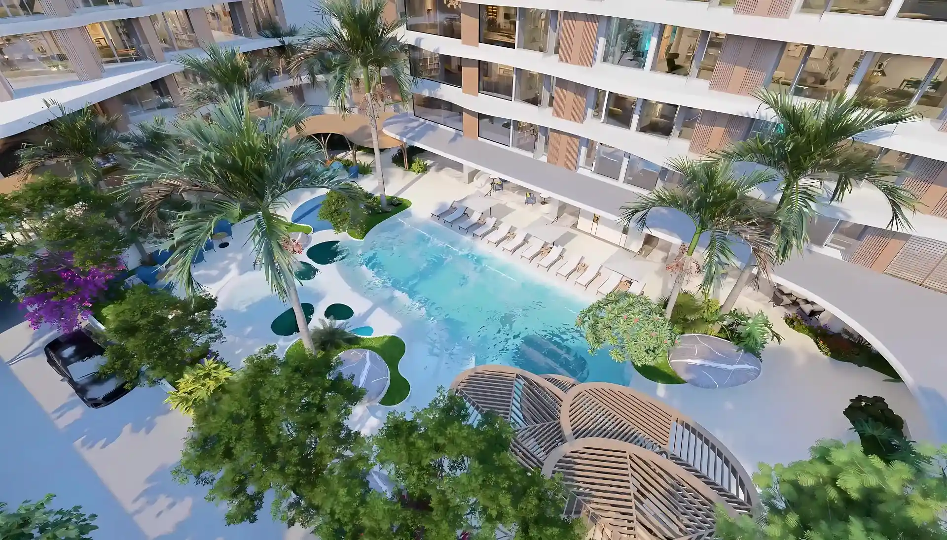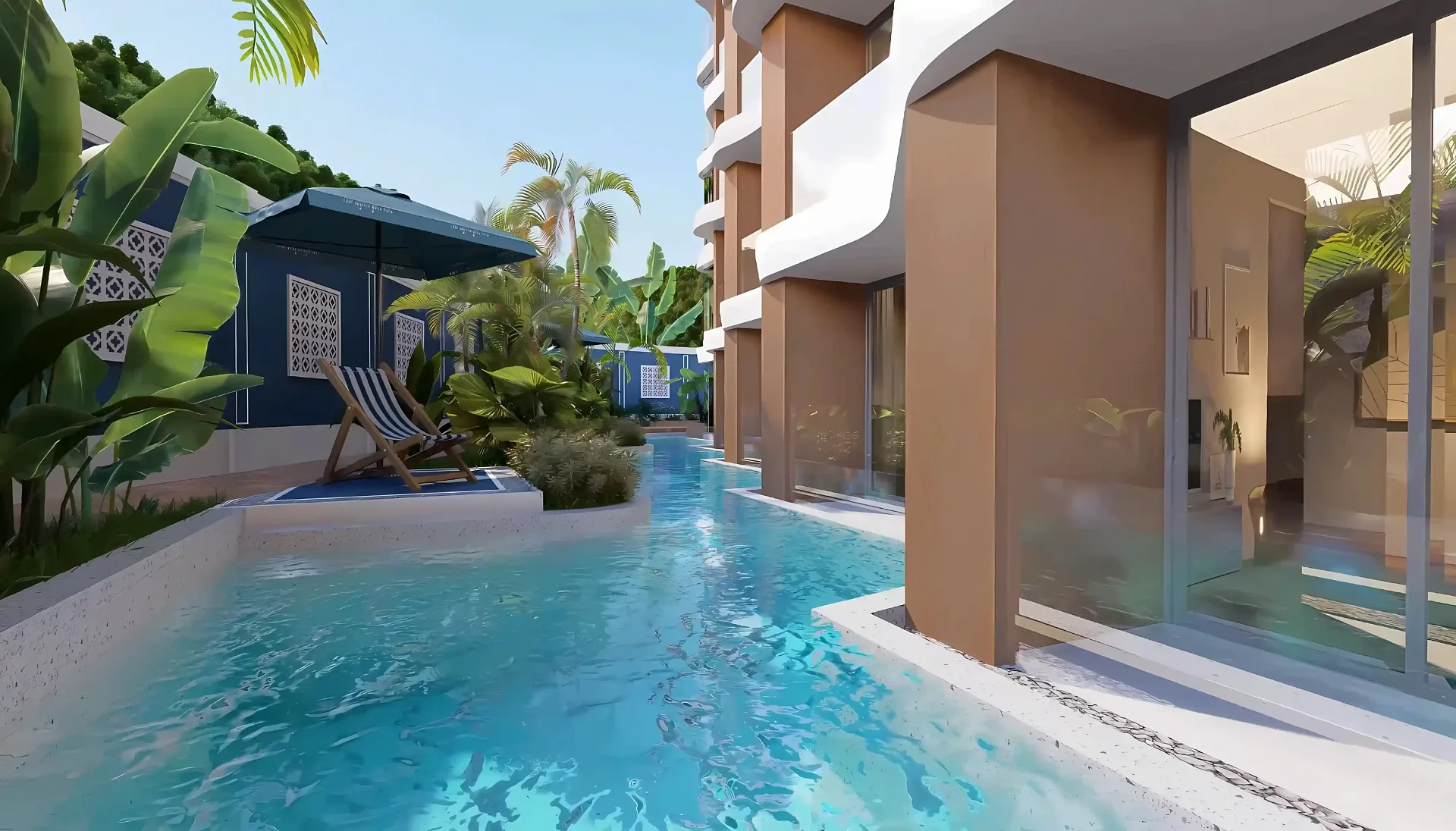 In Building C, select units offer direct balcony access to the pool and garden, providing enhanced privacy