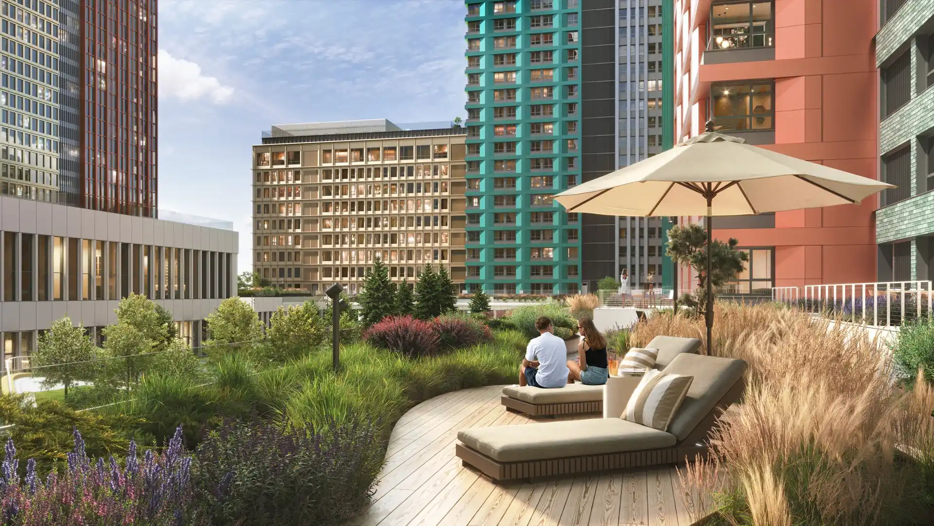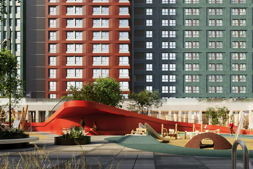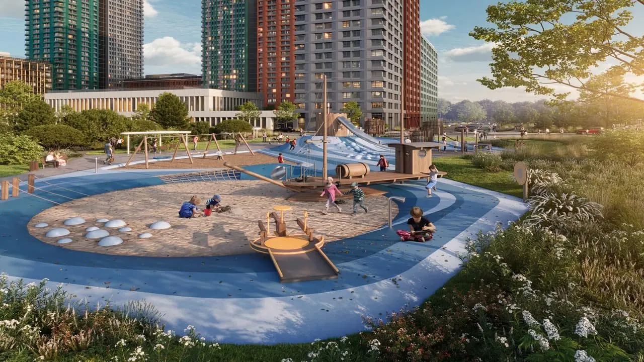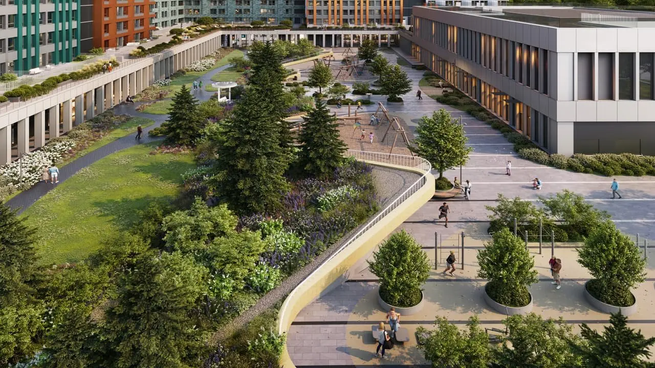 Квартал включает собственную школу, детский сад и парк-бульвар протяженностью 800 метров, который разделен на четыре функциональные зоны: спортивную площадь, главную площадь, зеленый и игровой бульвары.