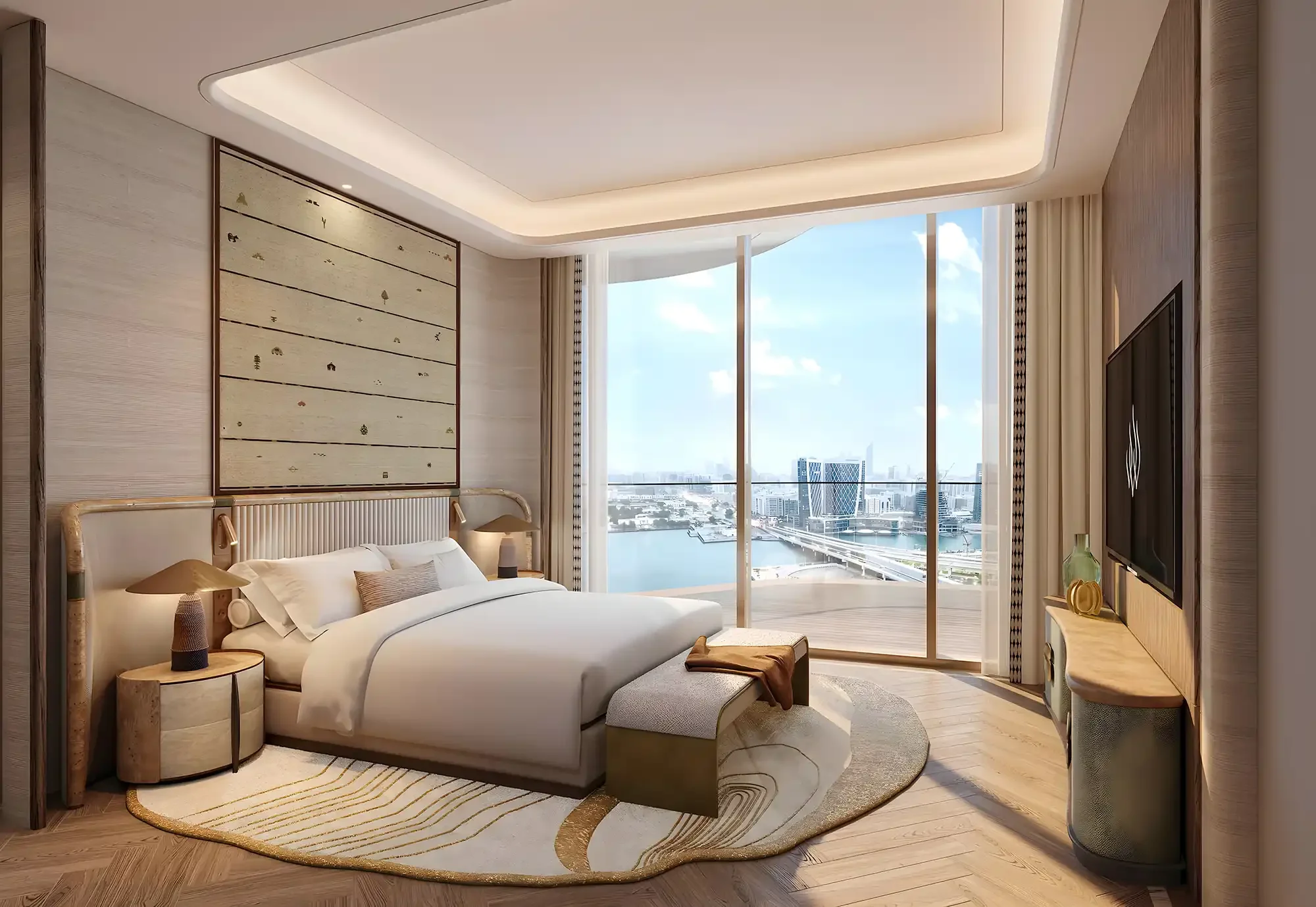 The area includes waterfront promenades, Rosewood and Four Seasons hotels, and is 14 minutes from the Saadiyat cultural district.
