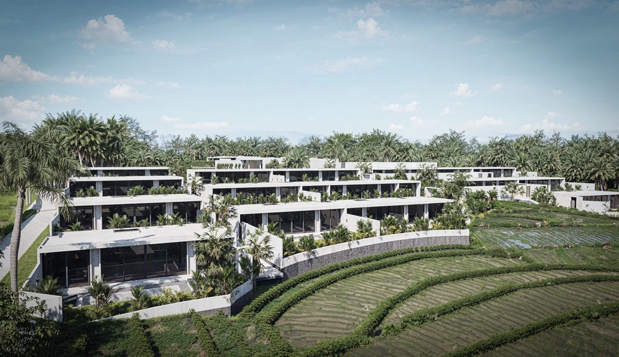 The project is nestled among rice fields, not far from the ocean