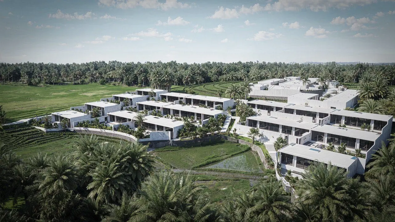 The complex is surrounded by scenic rice fields and situated just 13 minutes from a black volcanic sand beach. Within 36 minutes you’ll find a hospital, kindergarten — 25 minutes, school — 27 minutes, supermarket — 24 minutes, and shopping mall — 29 minutes away.