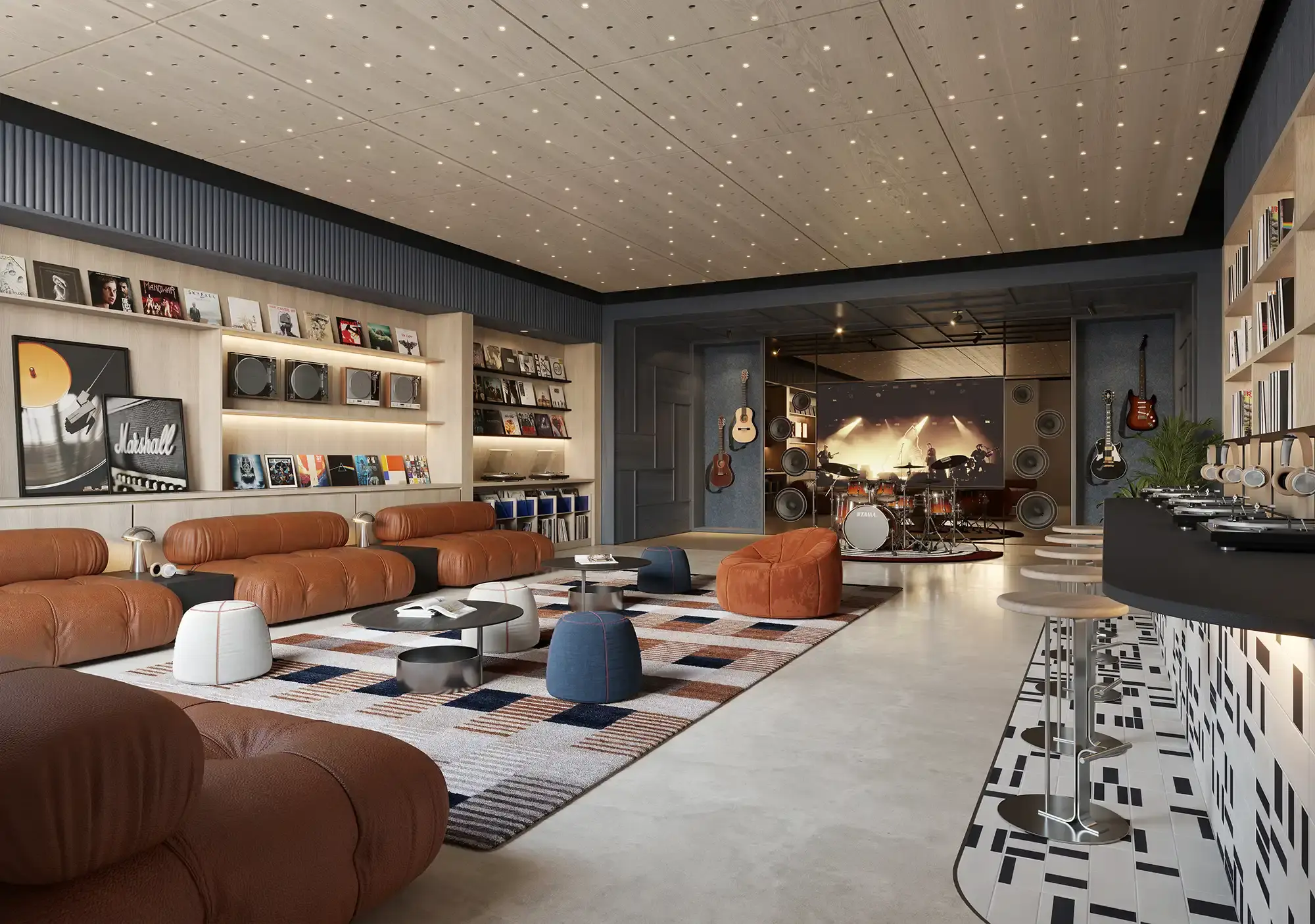 There are also five themed towers: Magenta and Neon — 21 residential floors, Azul — 27 residential floors, Teal and Cyan — 24 residential floors each.