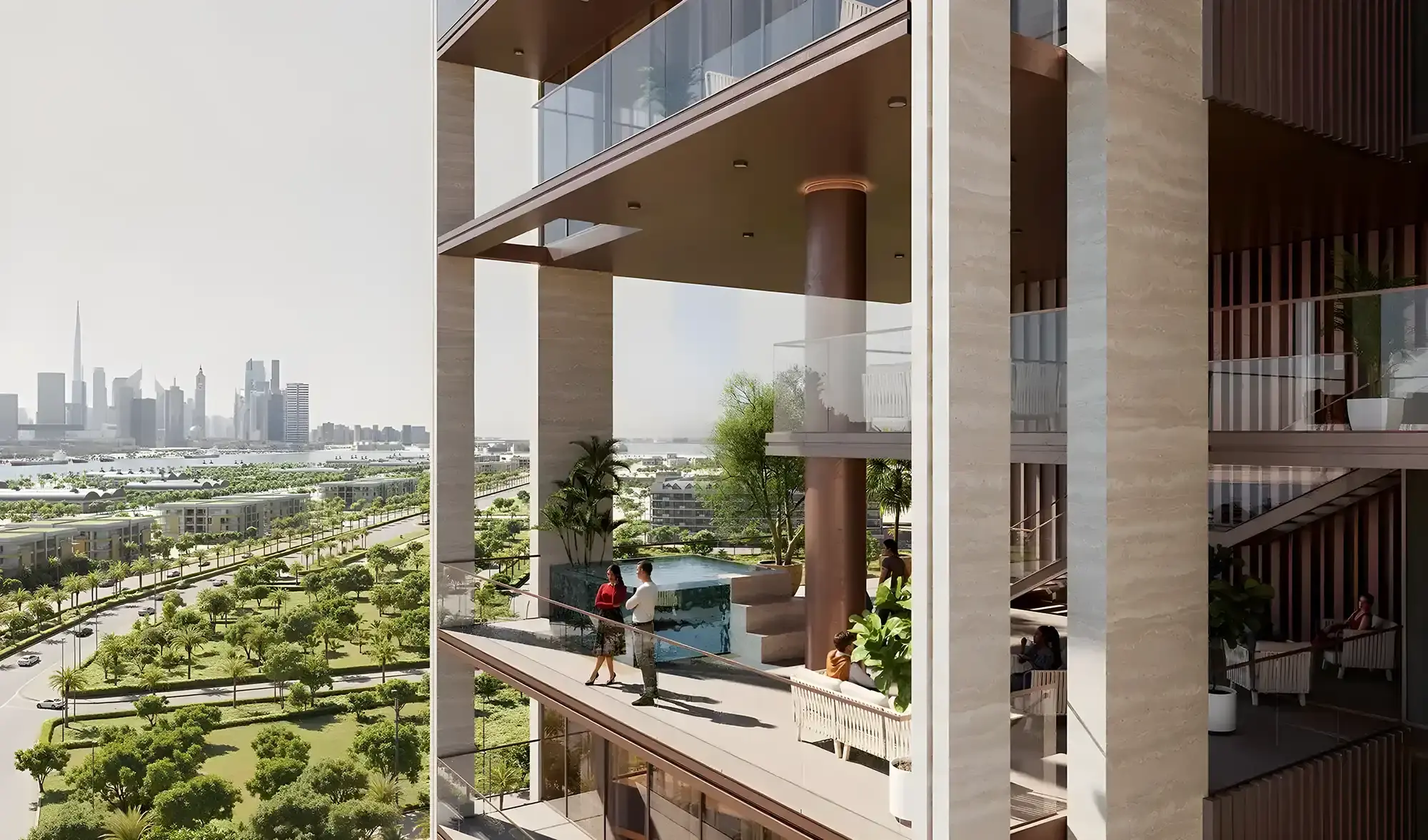 Nearby are Gold Souq, Dubai Creek harbor, and major retail destinations. The district concept focuses on an eco-friendly lifestyle.