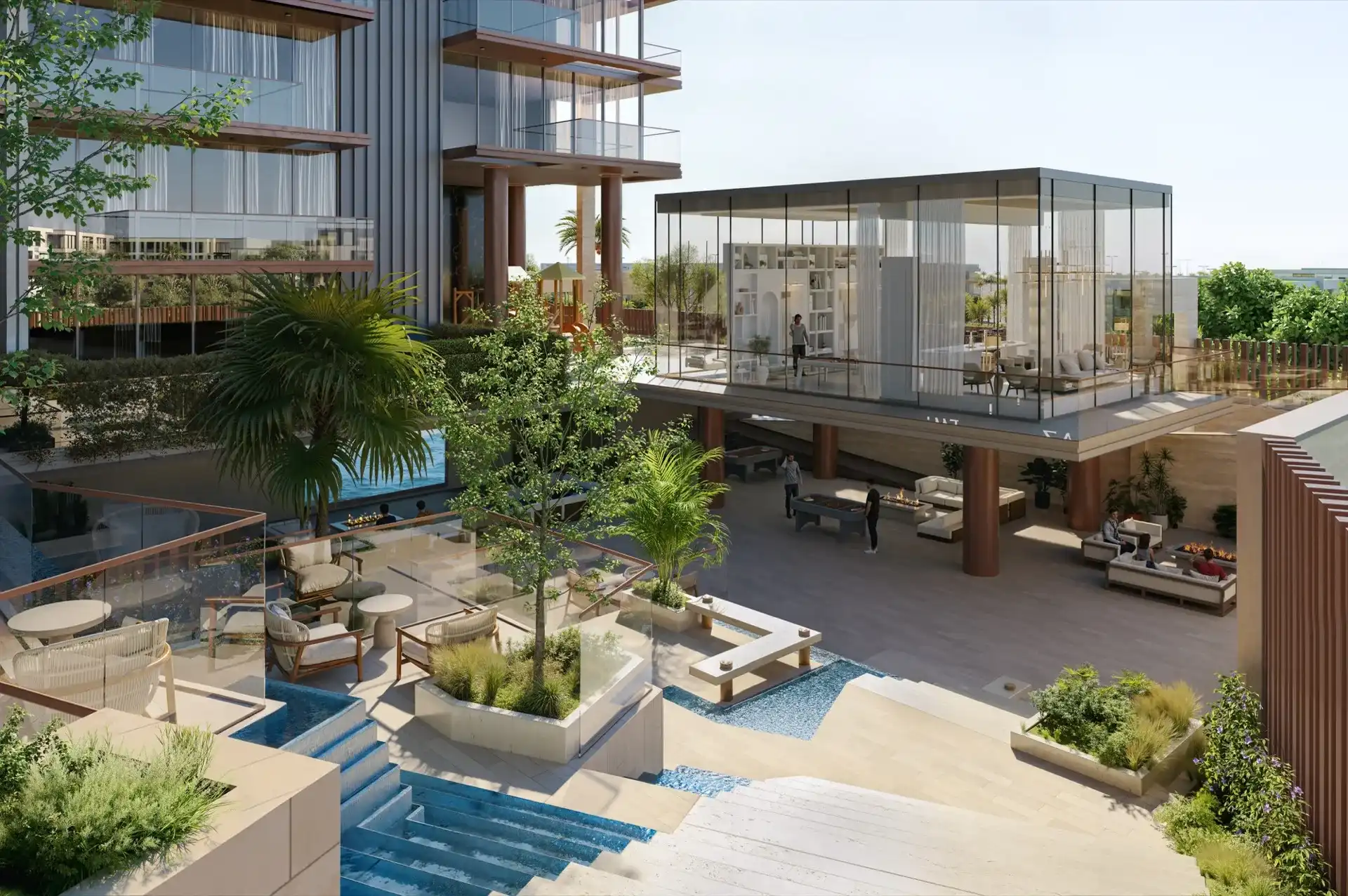 The complex infrastructure includes waterfalls and rooftop gardens, creating a resort atmosphere.