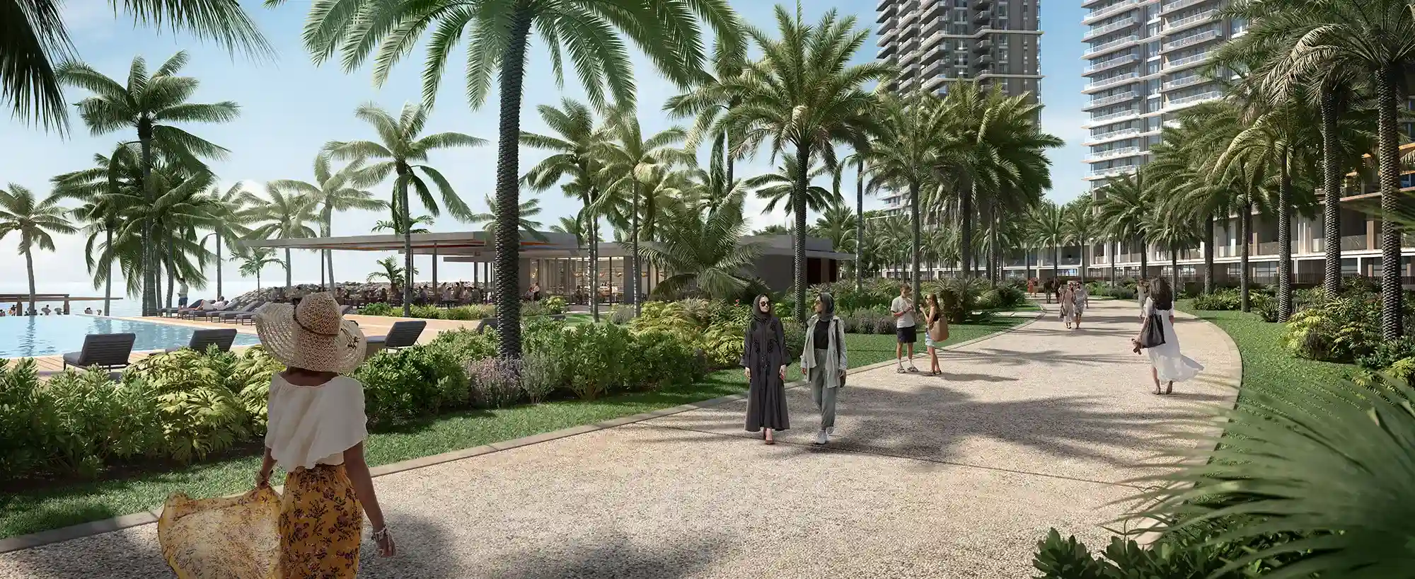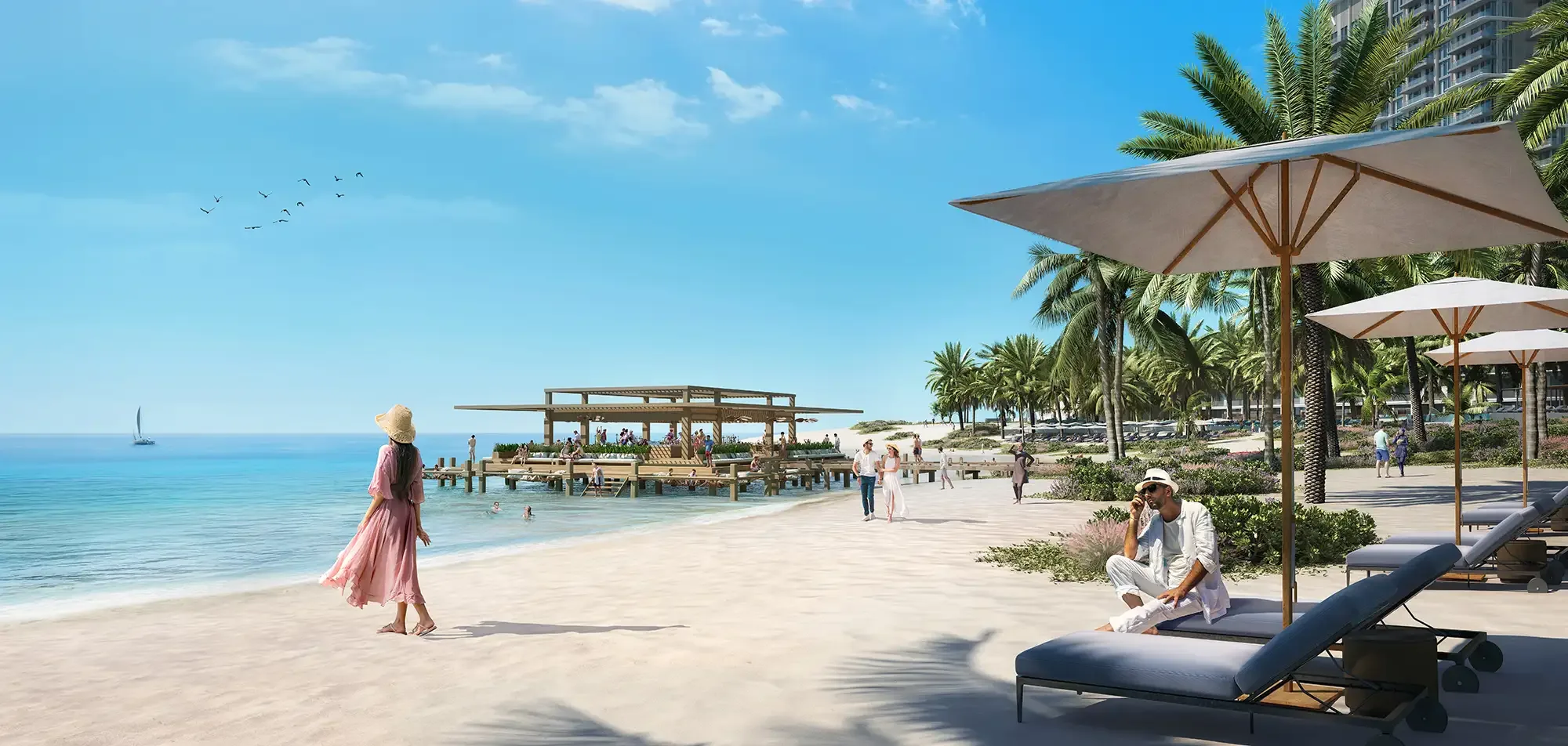 The development features a Beach Promenade, restaurants, and a private 600-meter beach for leisure and recreation.