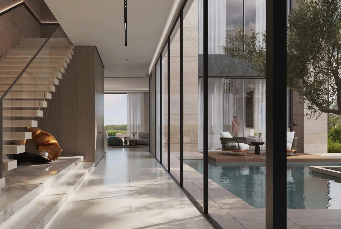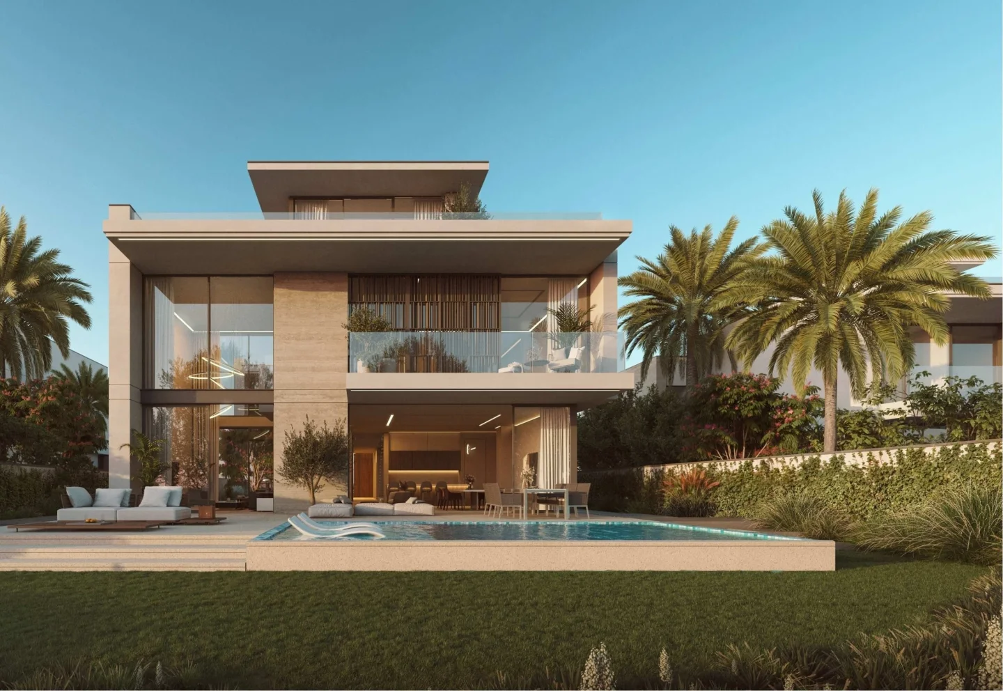 Villas are designed with open layouts, fully equipped kitchens, and walk-in wardrobes