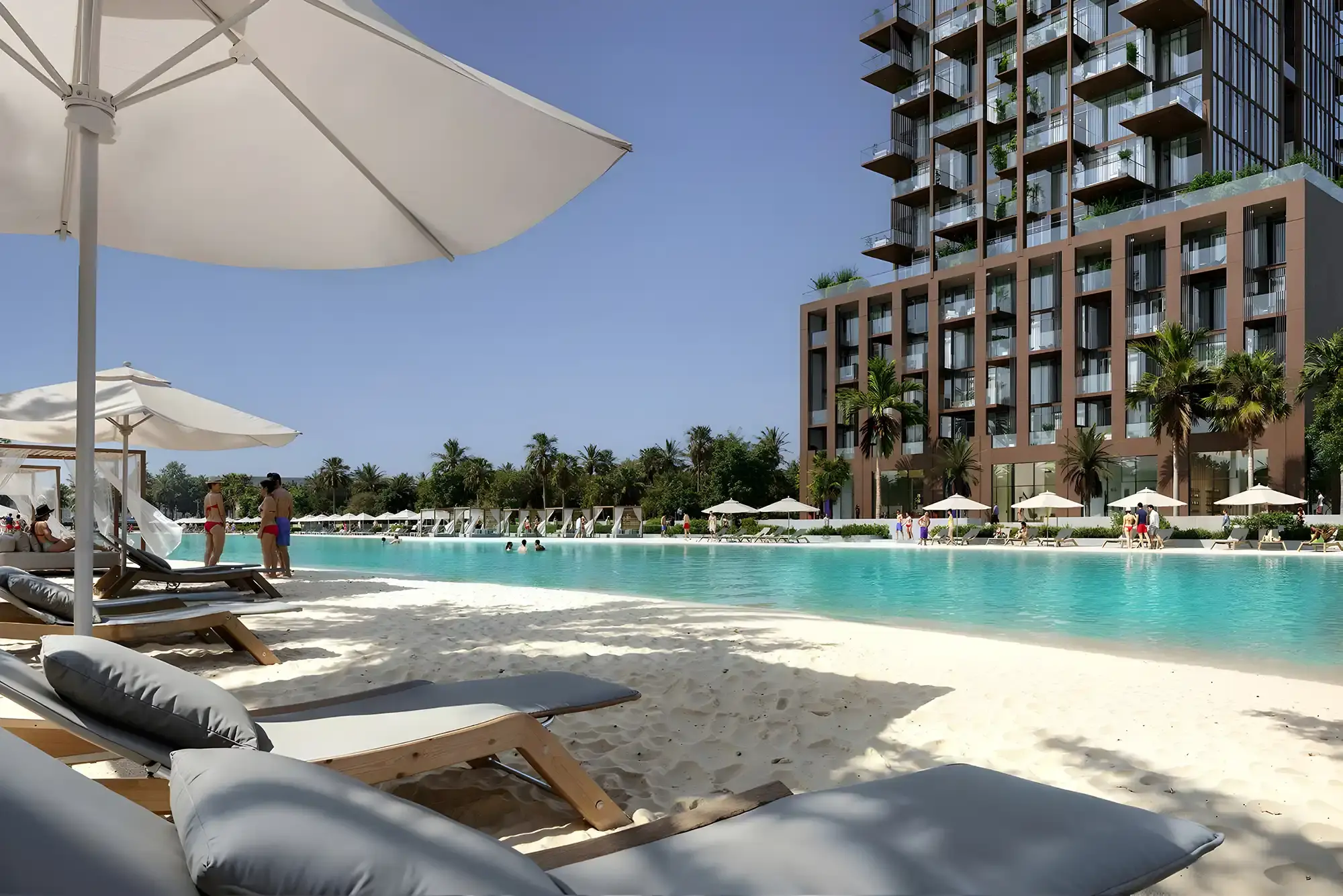 Meydan Horizon is a master-planned community facing the Ras Al Khor Wildlife Sanctuary, featuring four lagoons, sandy beaches, two schools, a clinic, and restaurants.
