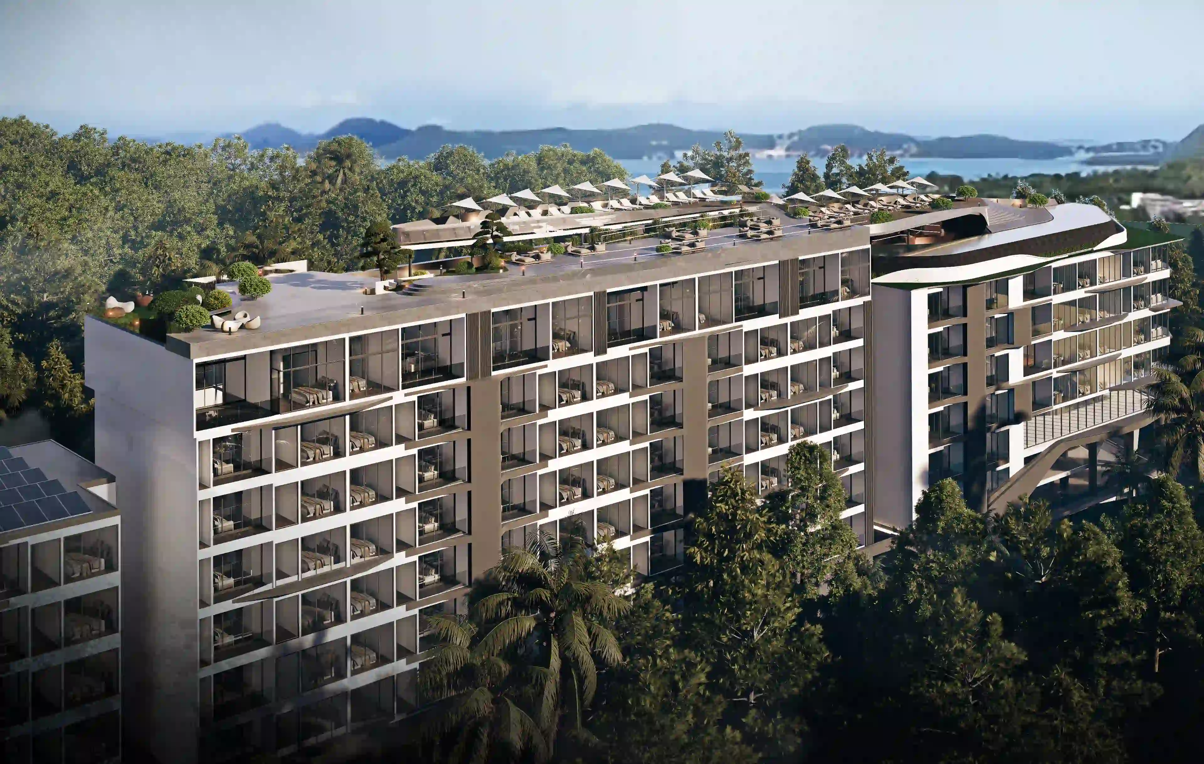Positioned on a scenic hilltop, the complex is among the tallest in the area, offering panoramic views of Rawai and Chalong bays on one side and the green hills near Nai Harn Beach on the other.