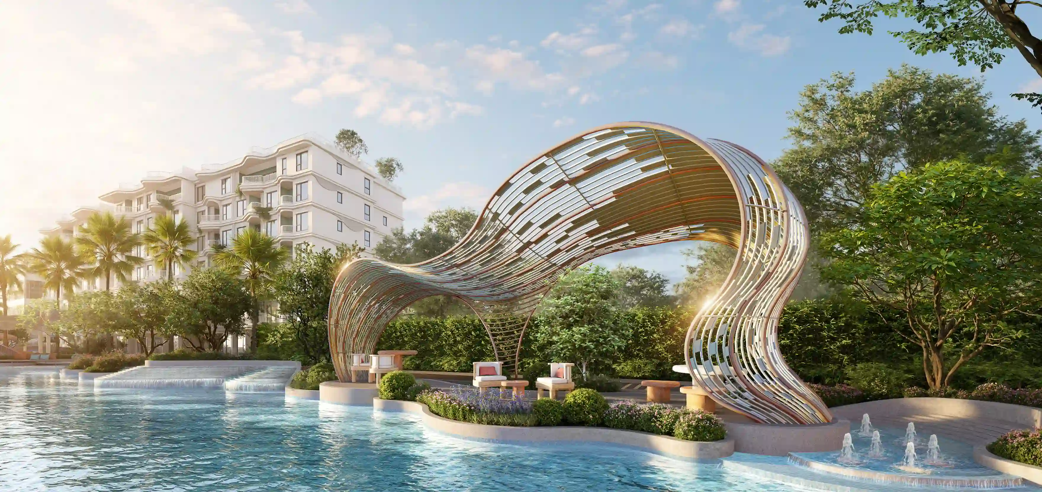 The territory features over 3,000 m² of landscaped green areas and 2,800 m² of swimming pools