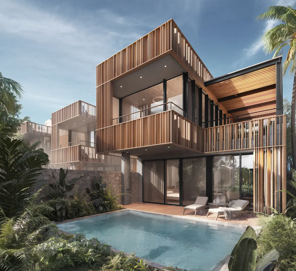 У вилл есть собственная территория с садом, отдельная парковка и часто личный бассейн