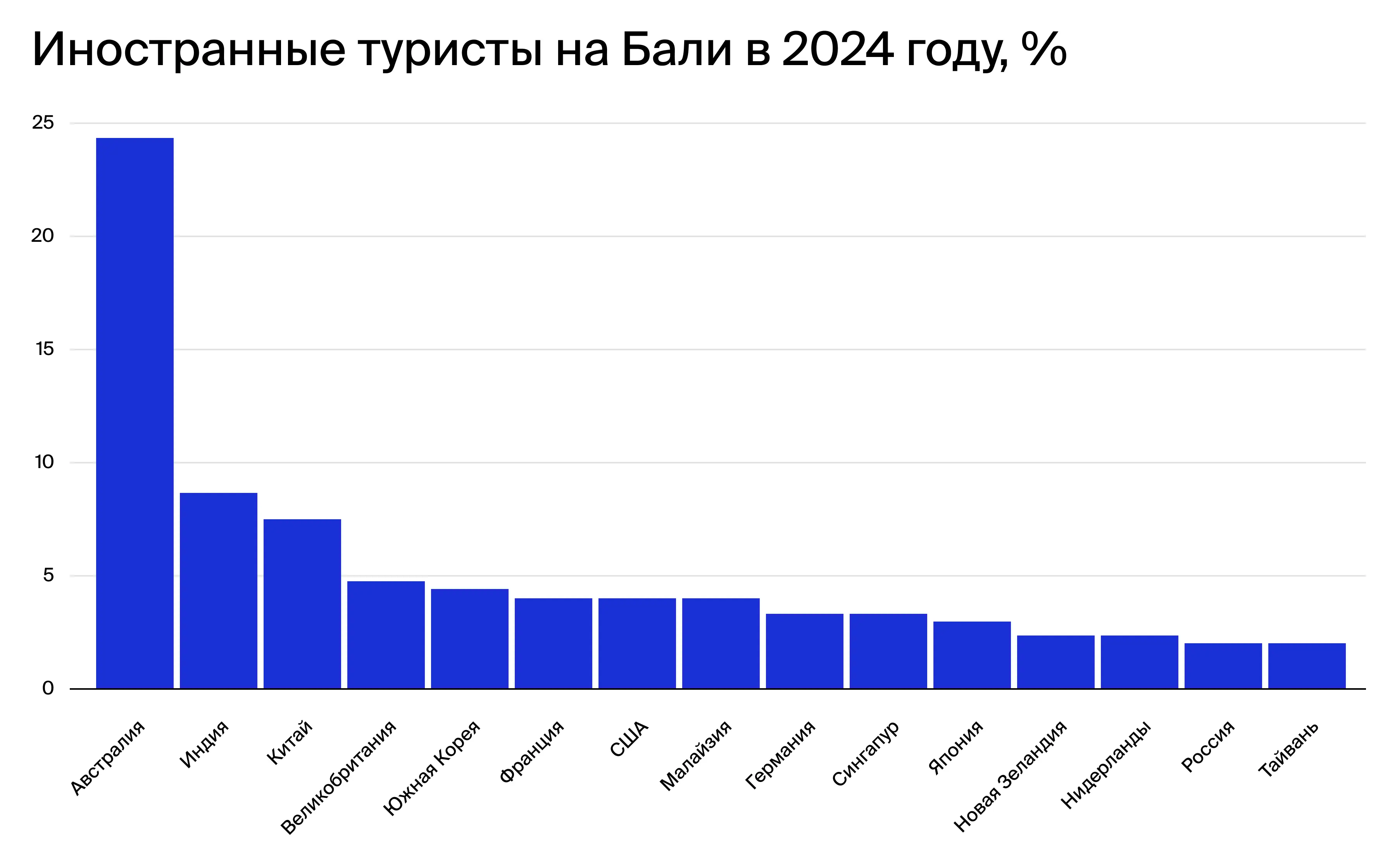 По данным Центрального статистического агентства Индонезии, международный турпоток продолжает расти: в период с января по 29 декабря 2024 года Бали посетили 6,3 млн туристов. Эта цифра на 19% больше, чем за аналогичный период прошлого года.