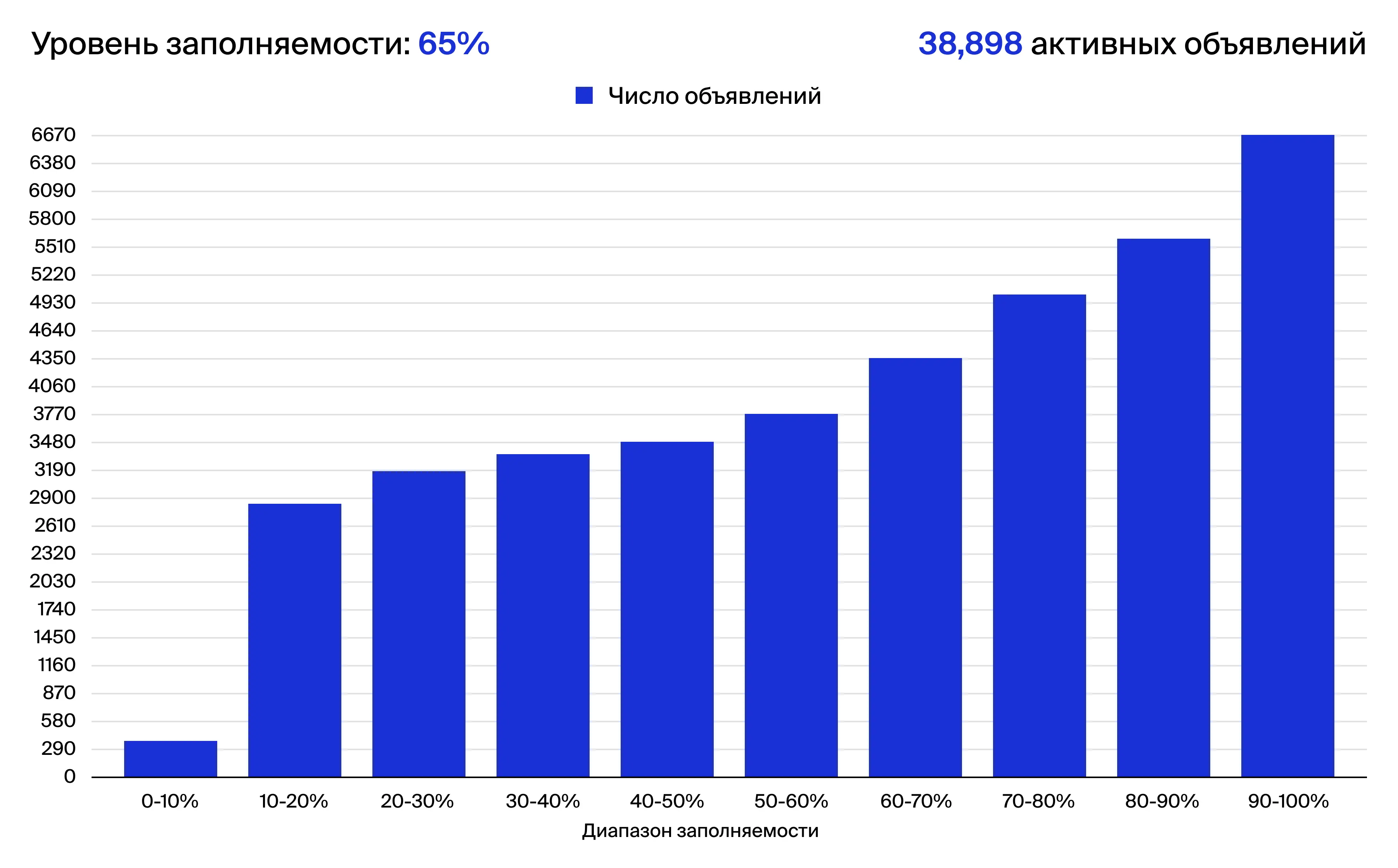 График показывает распределение объектов аренды на Бали по уровню заполняемости. Из 38 898 активных объявлений больше всего — в категории 90–100%, что говорит о высоком спросе. Также много объектов с загрузкой 70–90%. Это подтверждает высокую занятость и стабильную доходность от аренды
