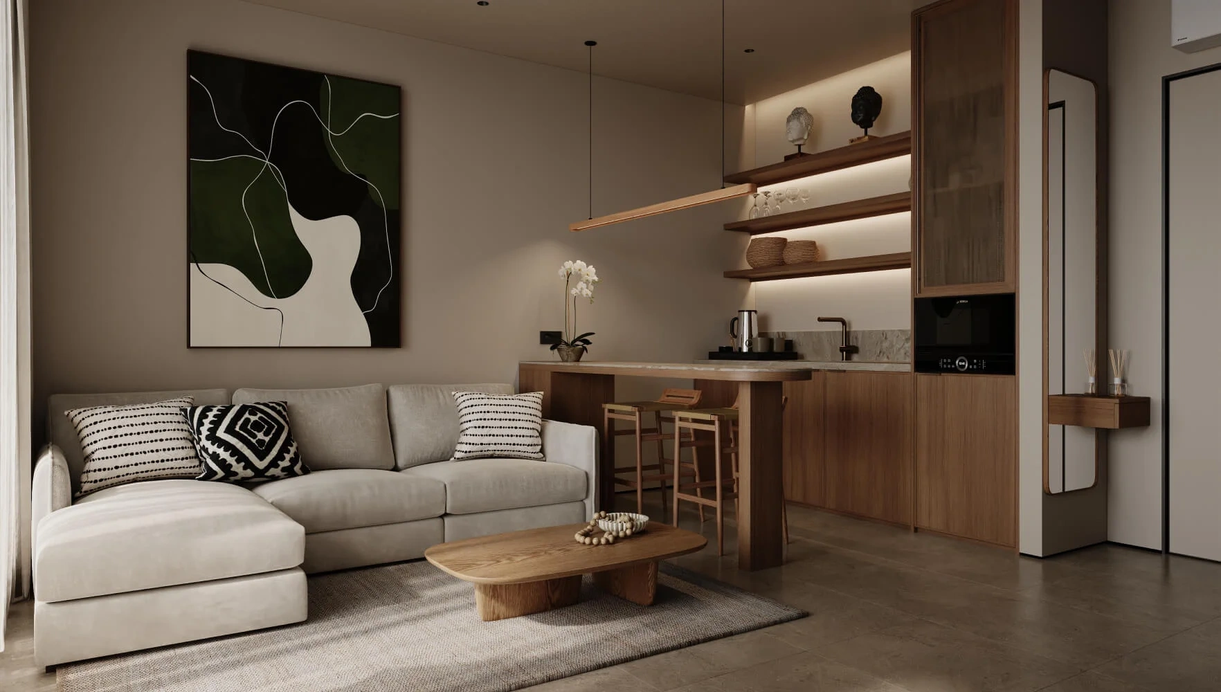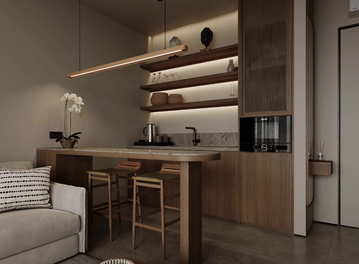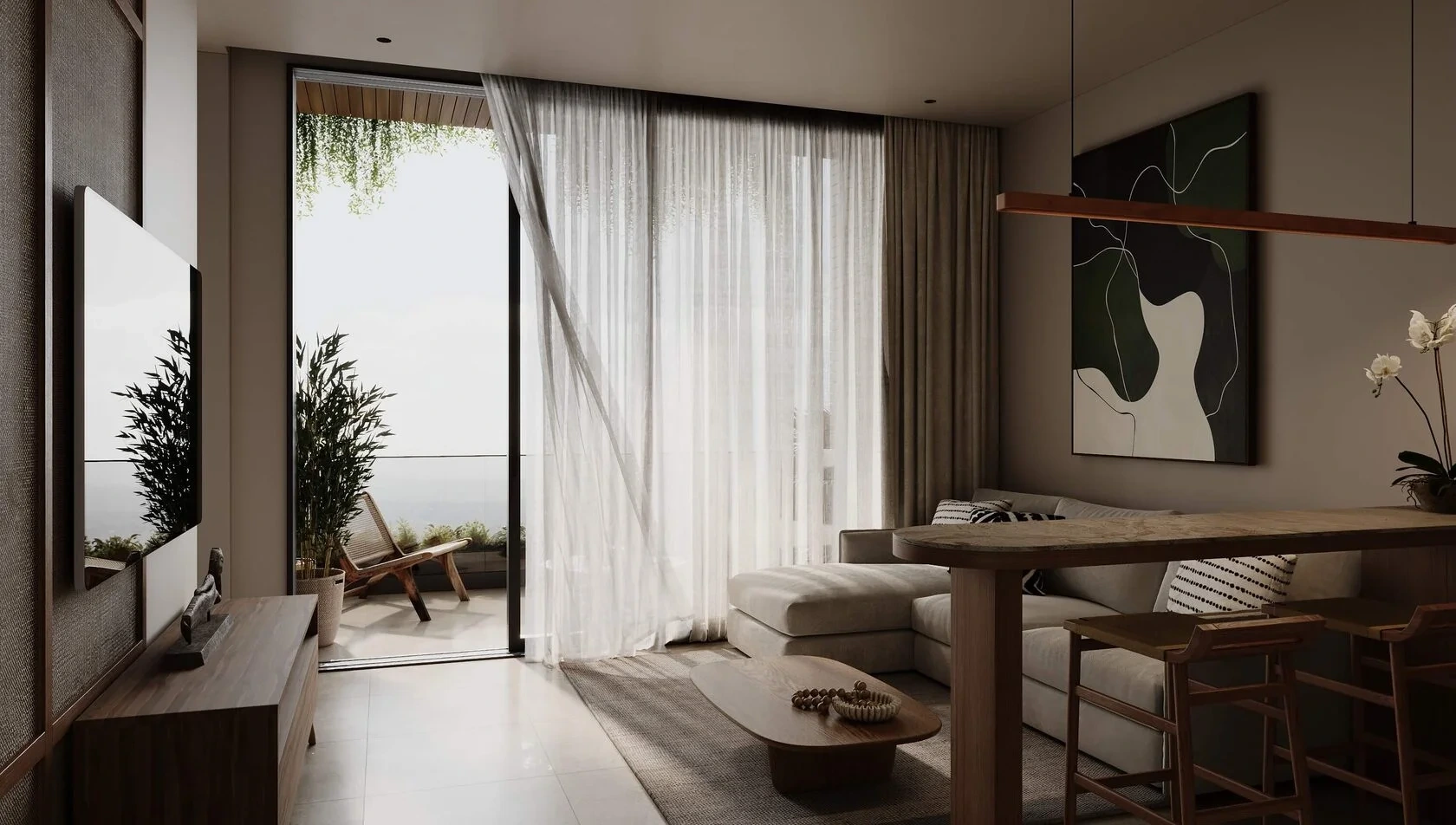 Каждый апартамент состоит из просторной гостиной-кухни с выходом на террасу, отдельной спальни с рабочим местом и гардеробной