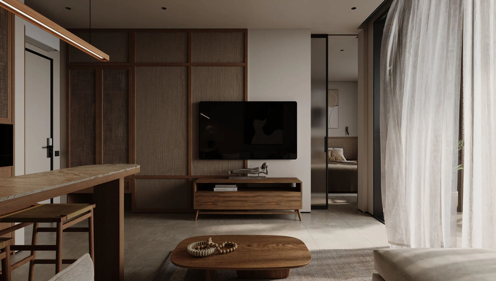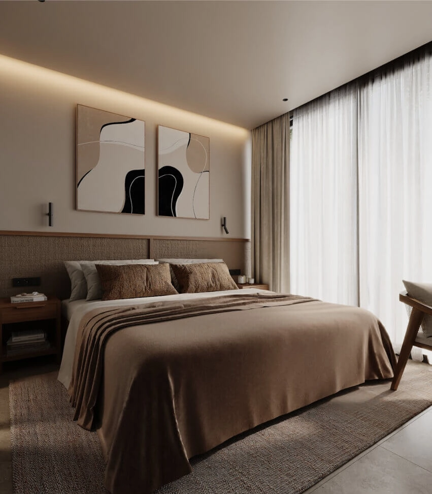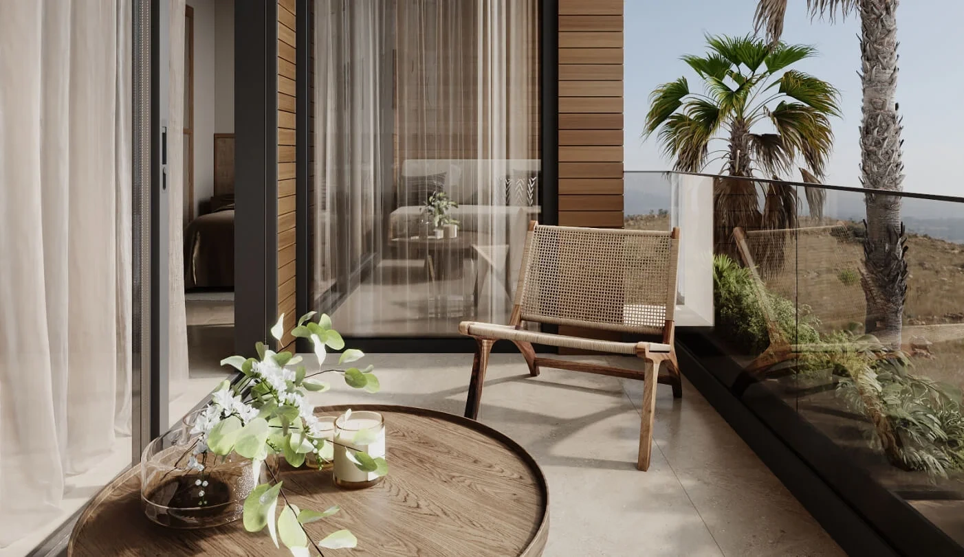 Каждый апартамент состоит из просторной гостиной-кухни с выходом на террасу, отдельной спальни с рабочим местом и гардеробной