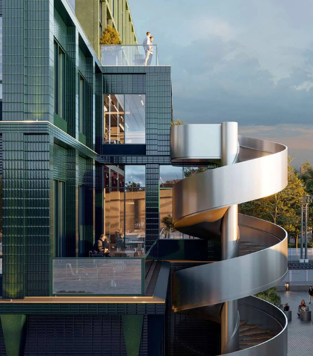 Уличная спиралевидная лестница, ведущая на террасы здания