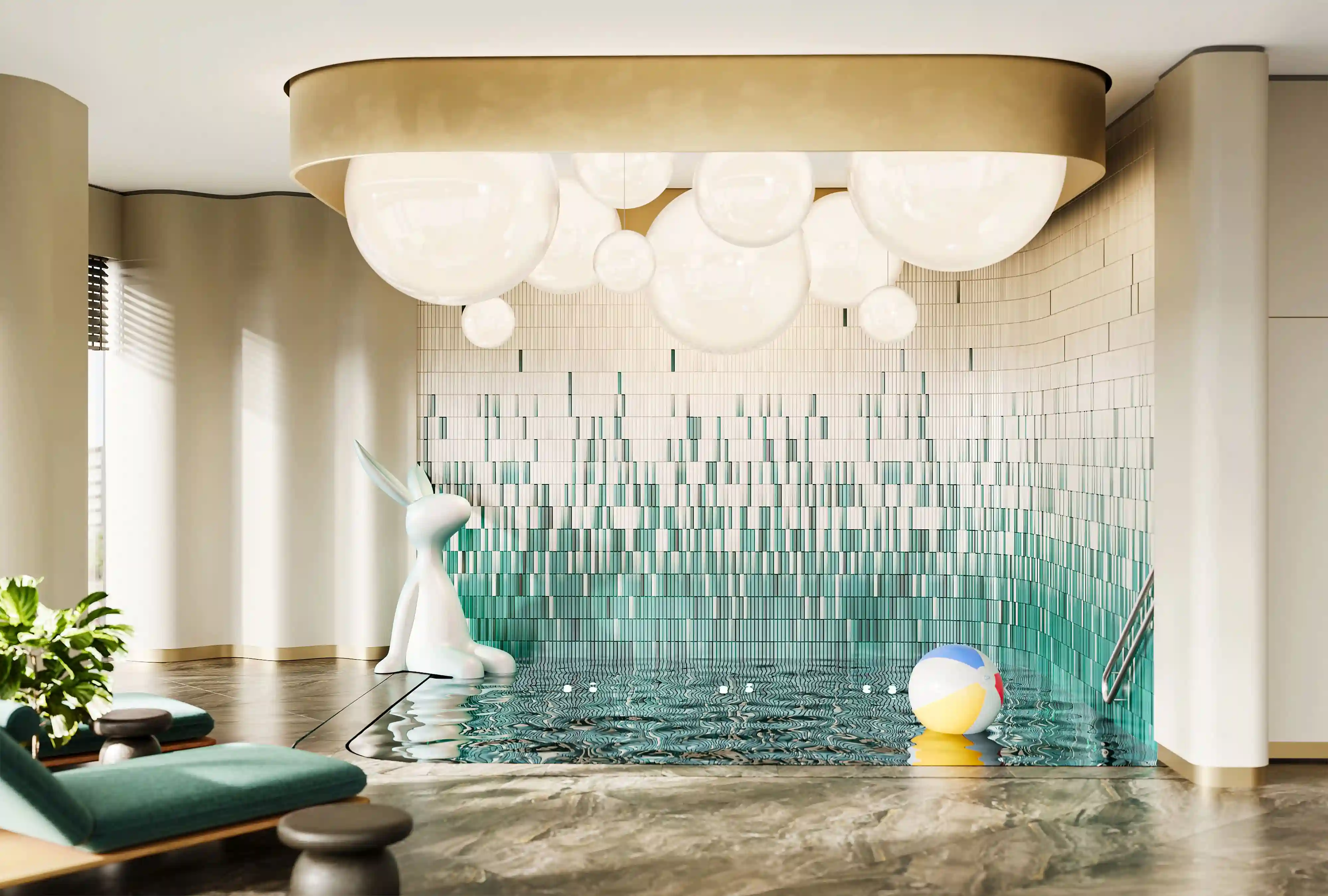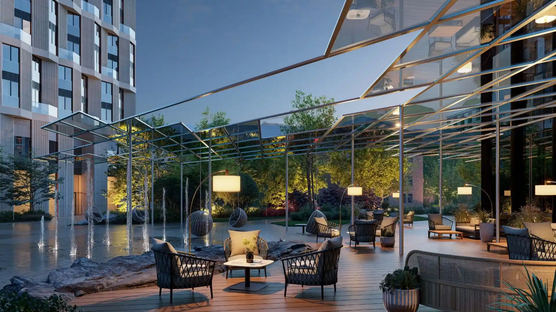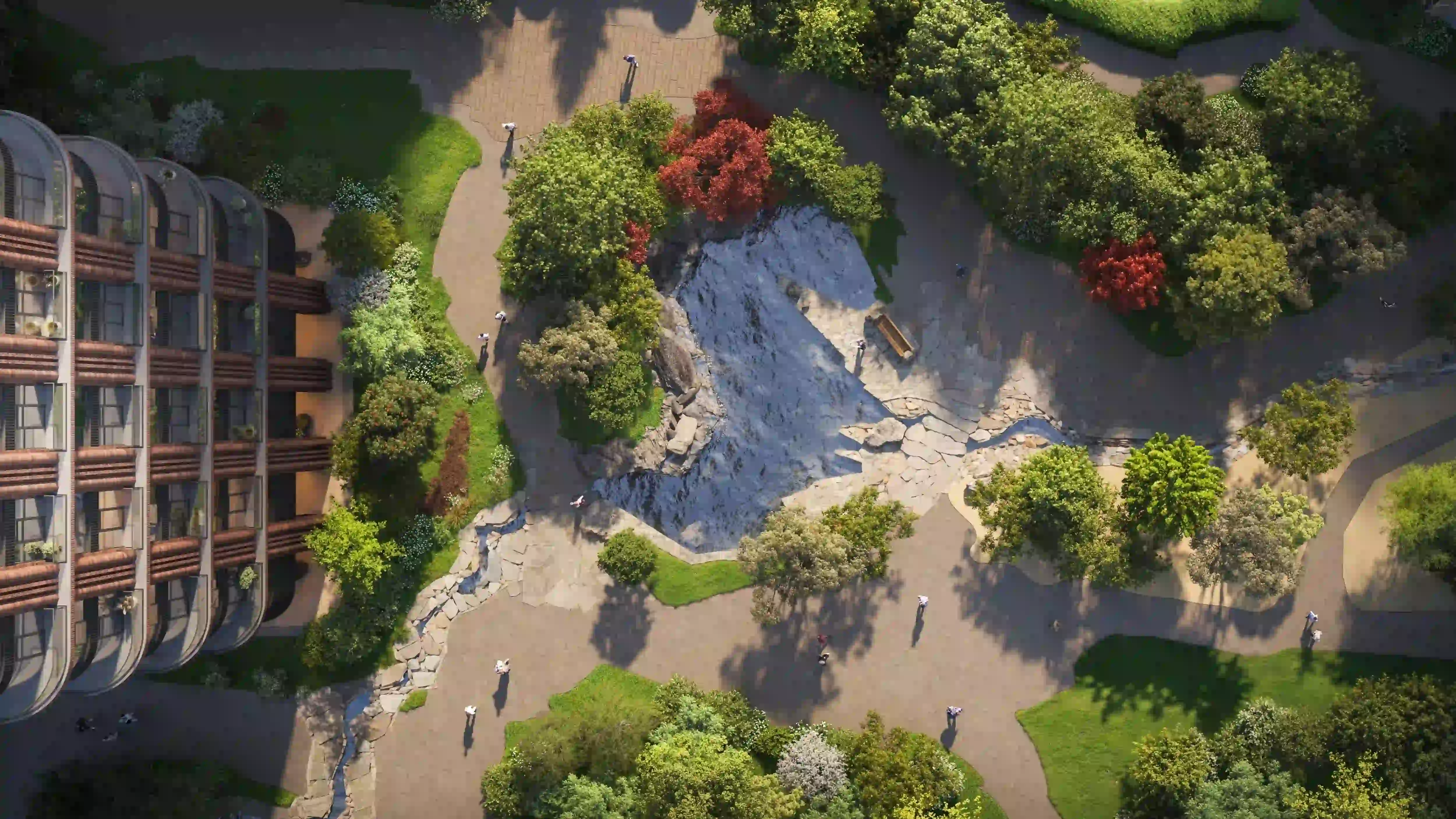 На территории квартала обустроен приватный двор-парк площадью 1,9 гектара, занимающий 70% всей площади. Уникальный прогулочный бульвар, доступный только для резидентов и их гостей, соединяет разнообразные зоны отдыха и декоративные водные элементы.