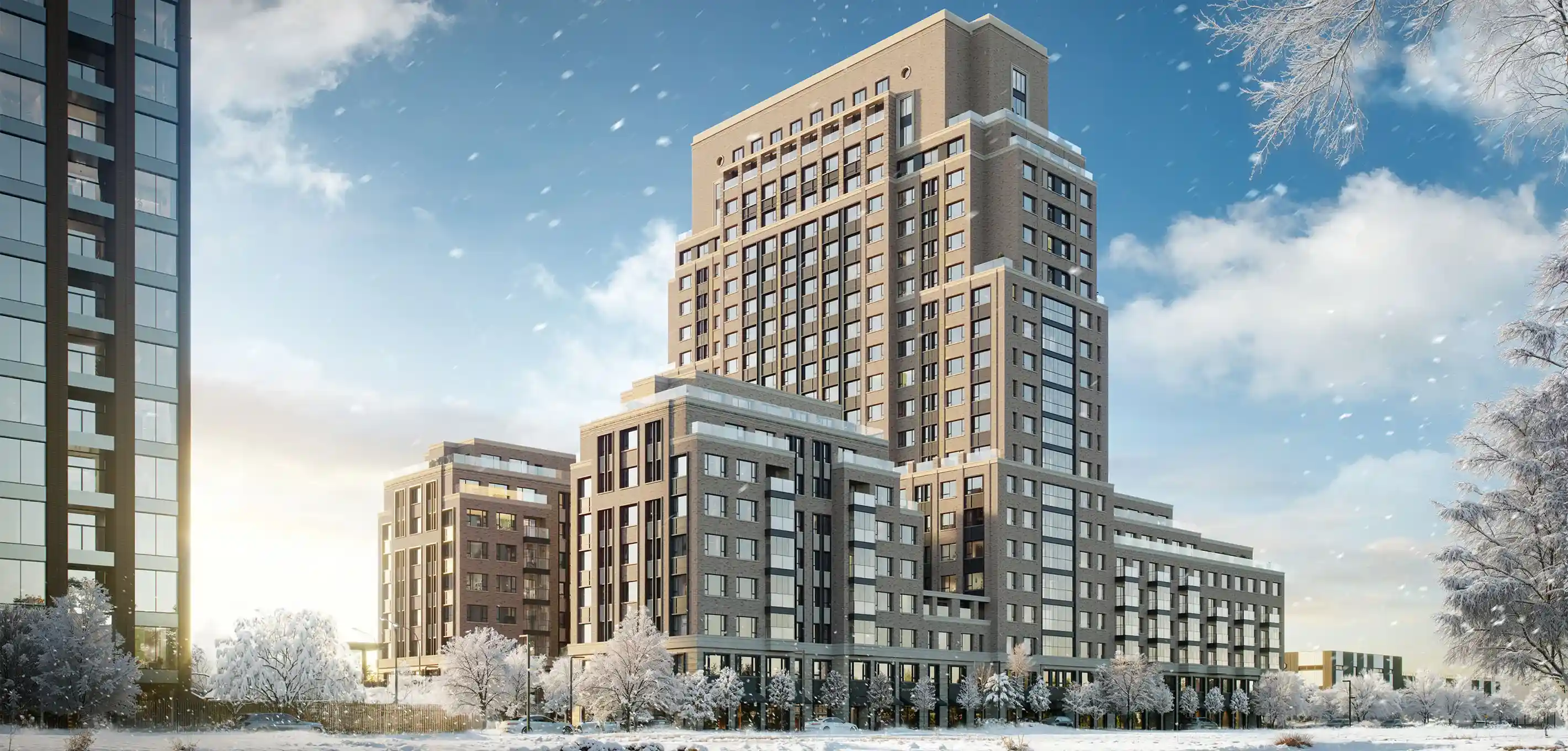 Архитектурной доминантой является 22-этажная башня, которую обрамляют две низкие секции, формируя замкнутый контур квартала с двумя многофункциональными дворами
