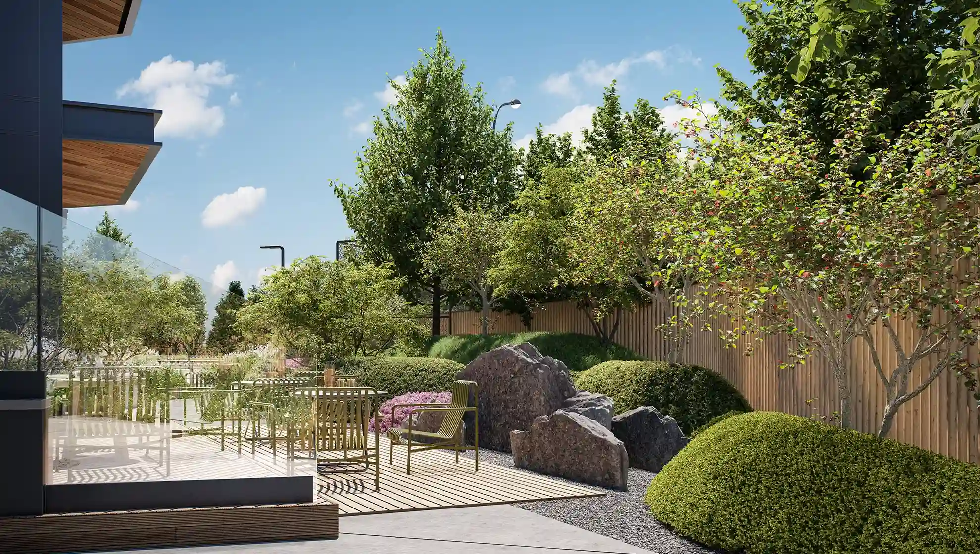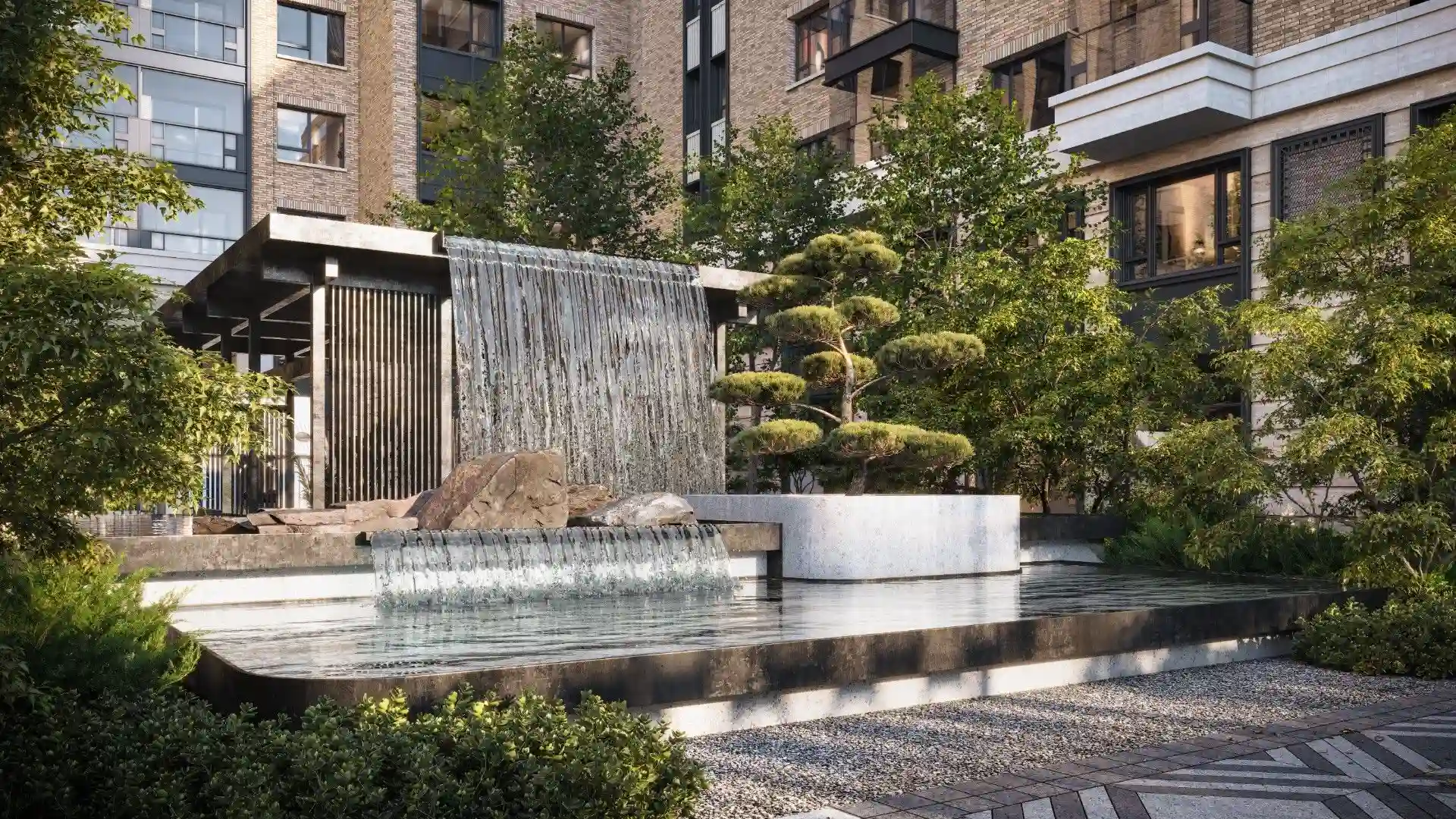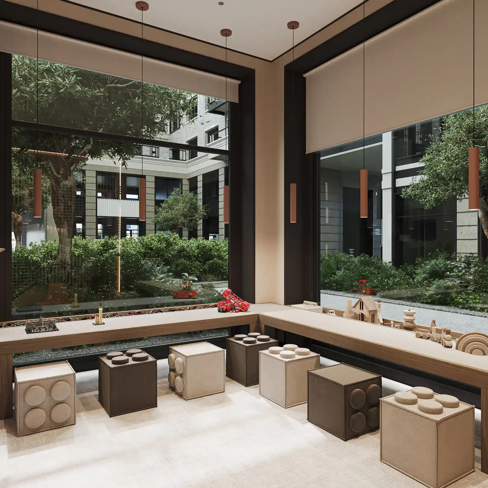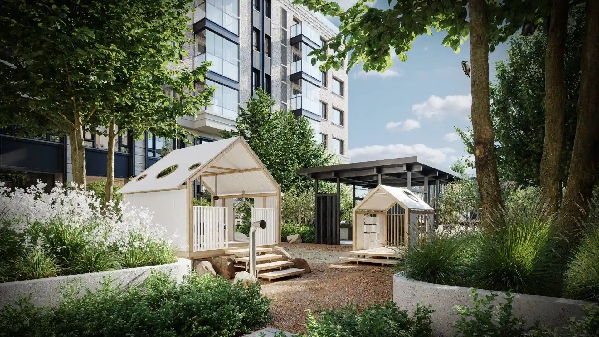 На территории запроектированы два приватных двора. Первый двор, примыкающий к главному лобби, предназначен для спокойного отдыха и оснащен зоной с мягкой мебелью. Во втором дворе расположены детские игровые площадки, беседки и декоративный водопад. В рамках квартала будут построены два павильона для размещения кафетерия, детского клуба и кинотеатра.
