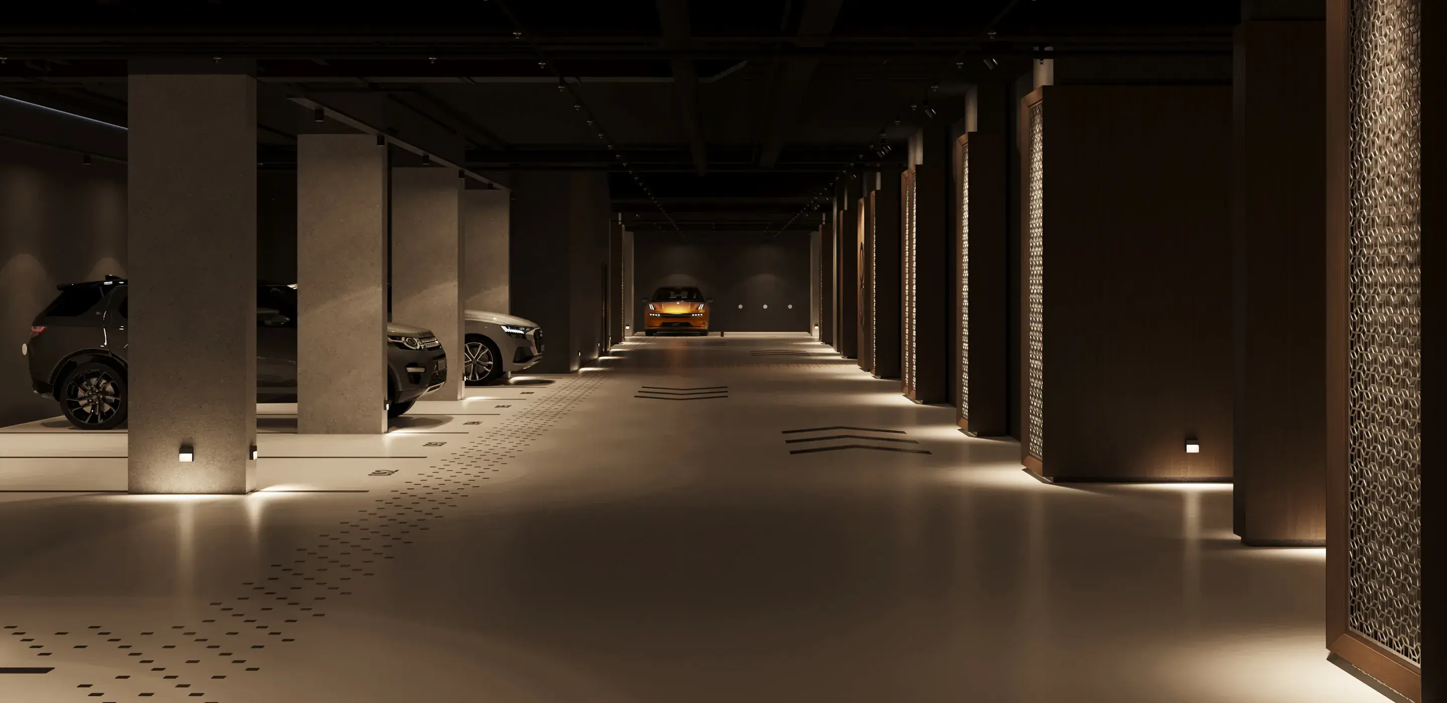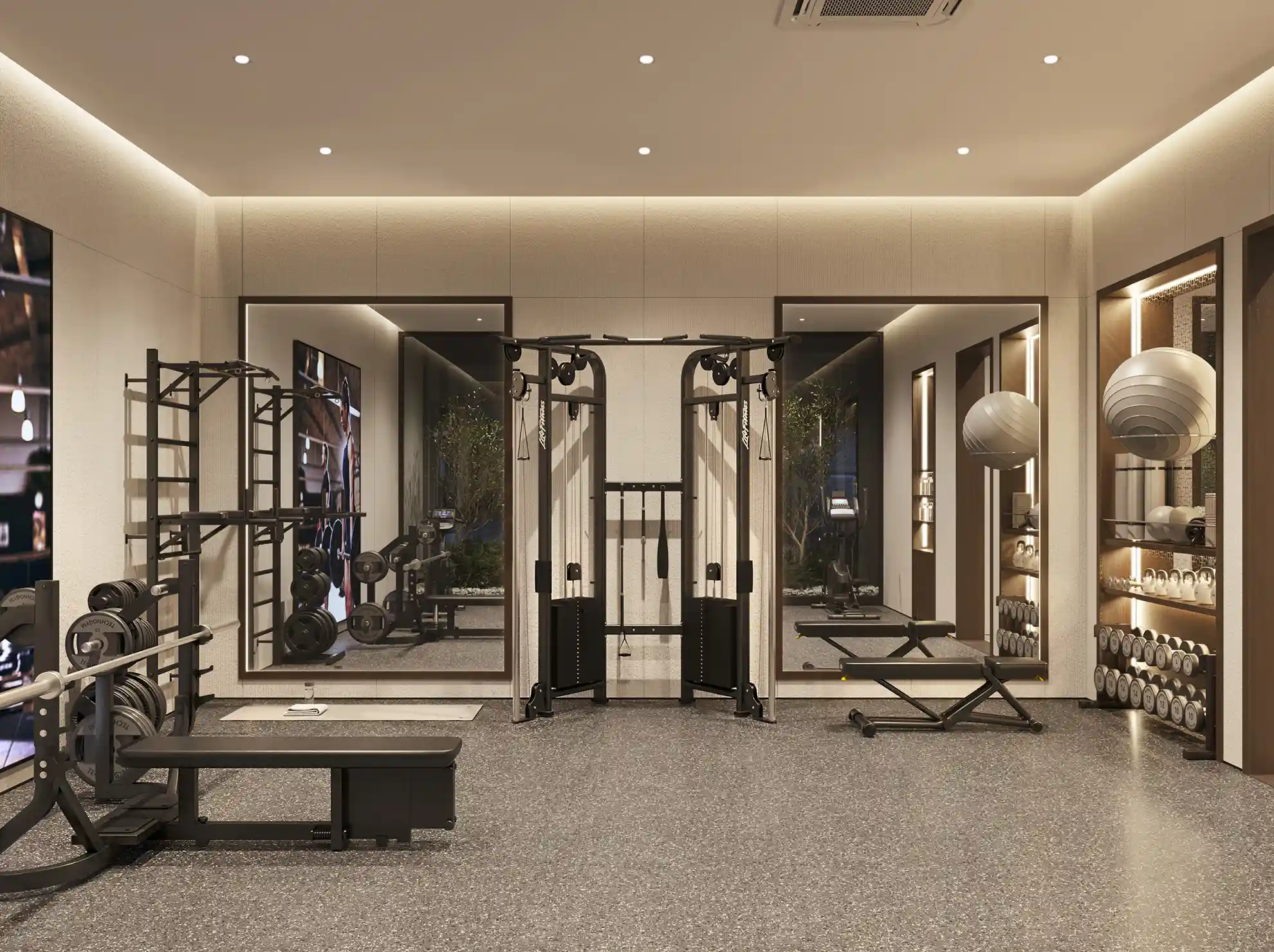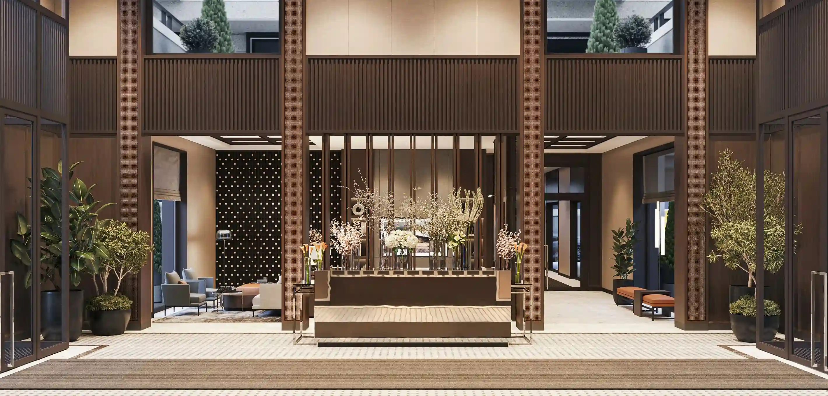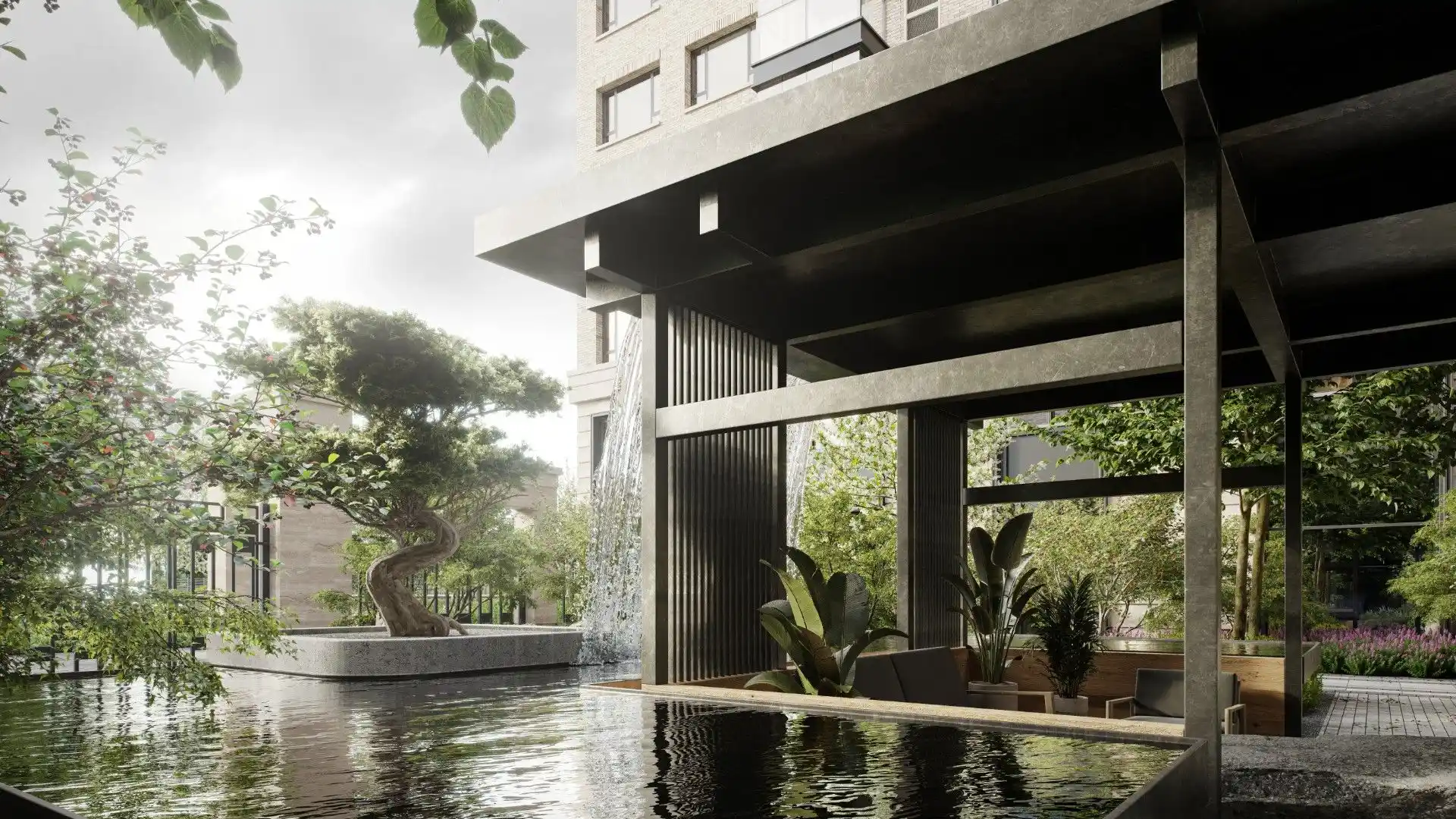 На территории запроектированы два приватных двора. Первый двор, примыкающий к главному лобби, предназначен для спокойного отдыха и оснащен зоной с мягкой мебелью. Во втором дворе расположены детские игровые площадки, беседки и декоративный водопад. В рамках квартала будут построены два павильона для размещения кафетерия, детского клуба и кинотеатра.
