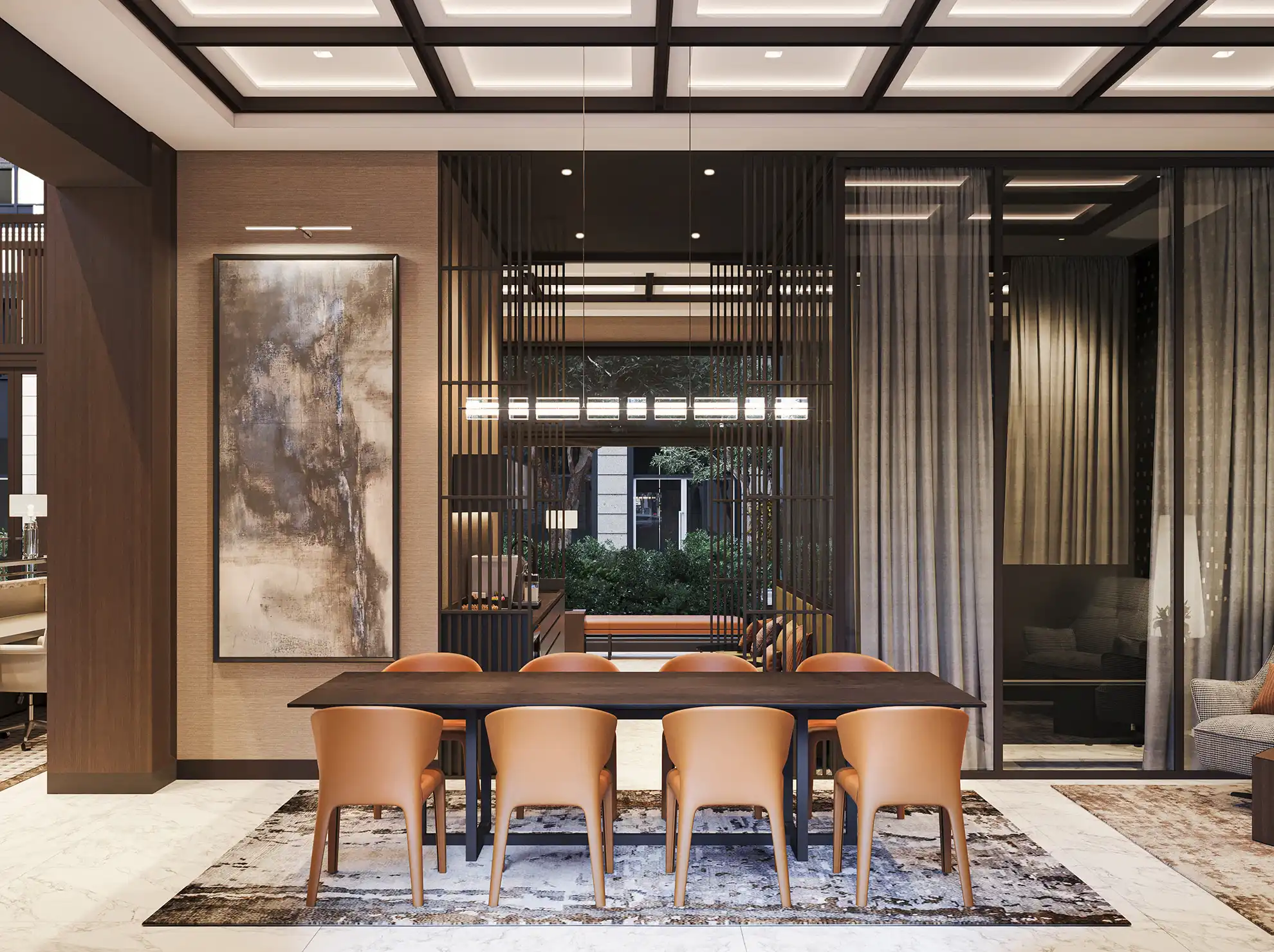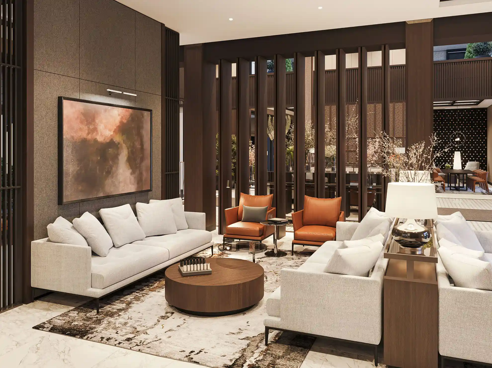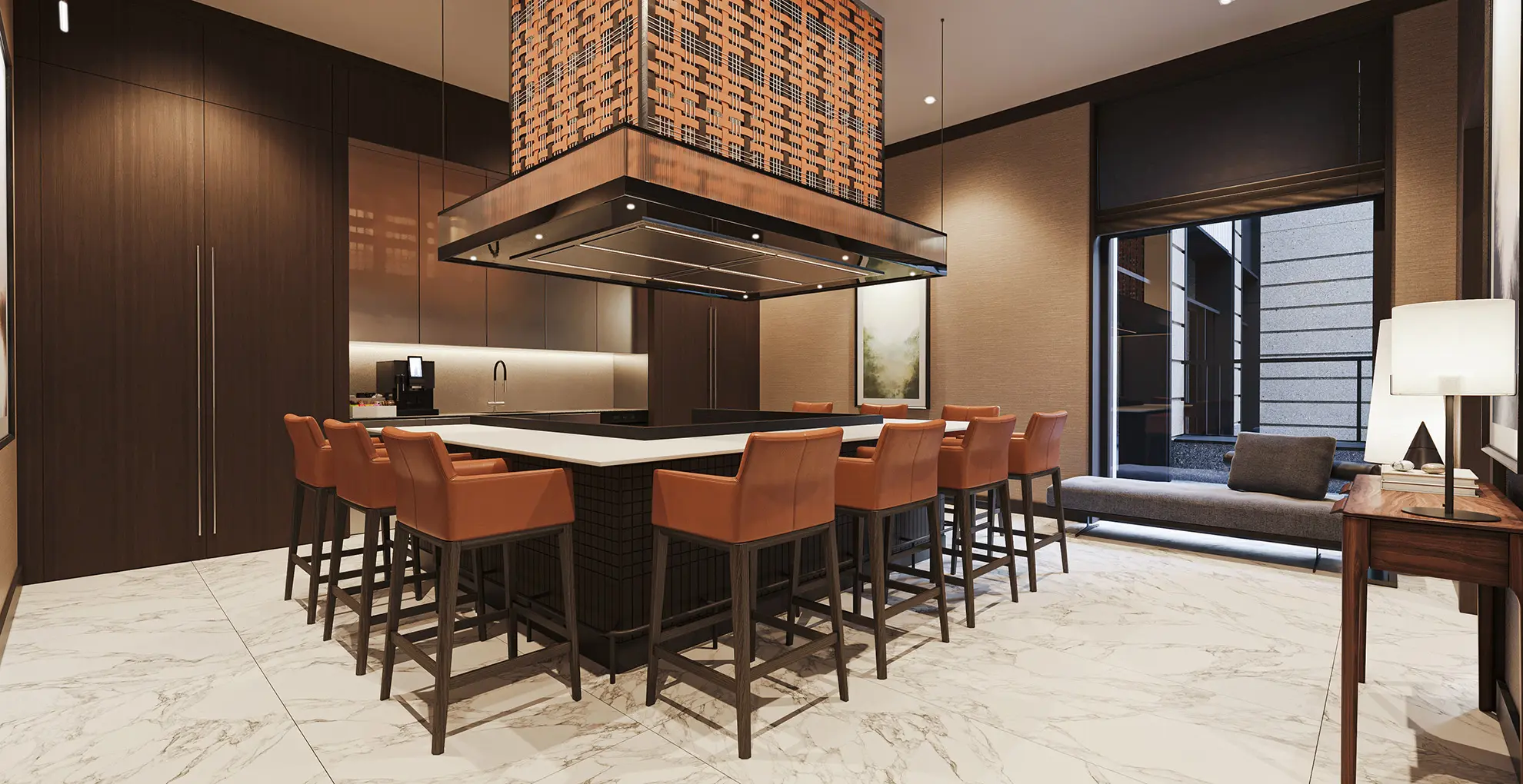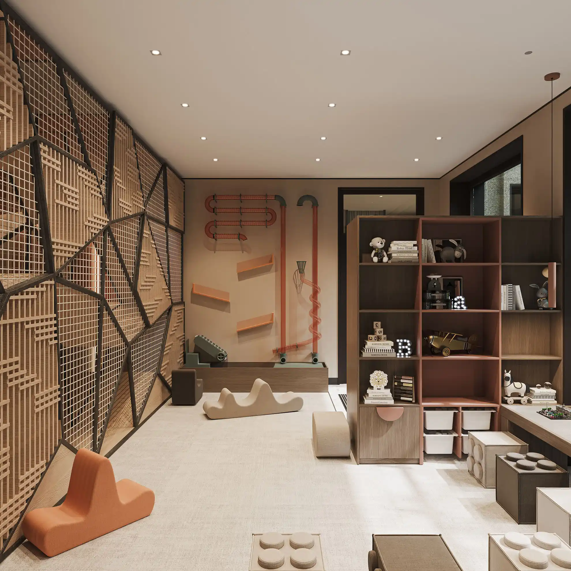 На территории запроектированы два приватных двора. Первый двор, примыкающий к главному лобби, предназначен для спокойного отдыха и оснащен зоной с мягкой мебелью. Во втором дворе расположены детские игровые площадки, беседки и декоративный водопад. В рамках квартала будут построены два павильона для размещения кафетерия, детского клуба и кинотеатра.
