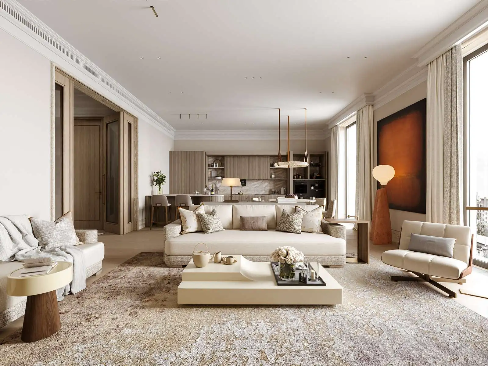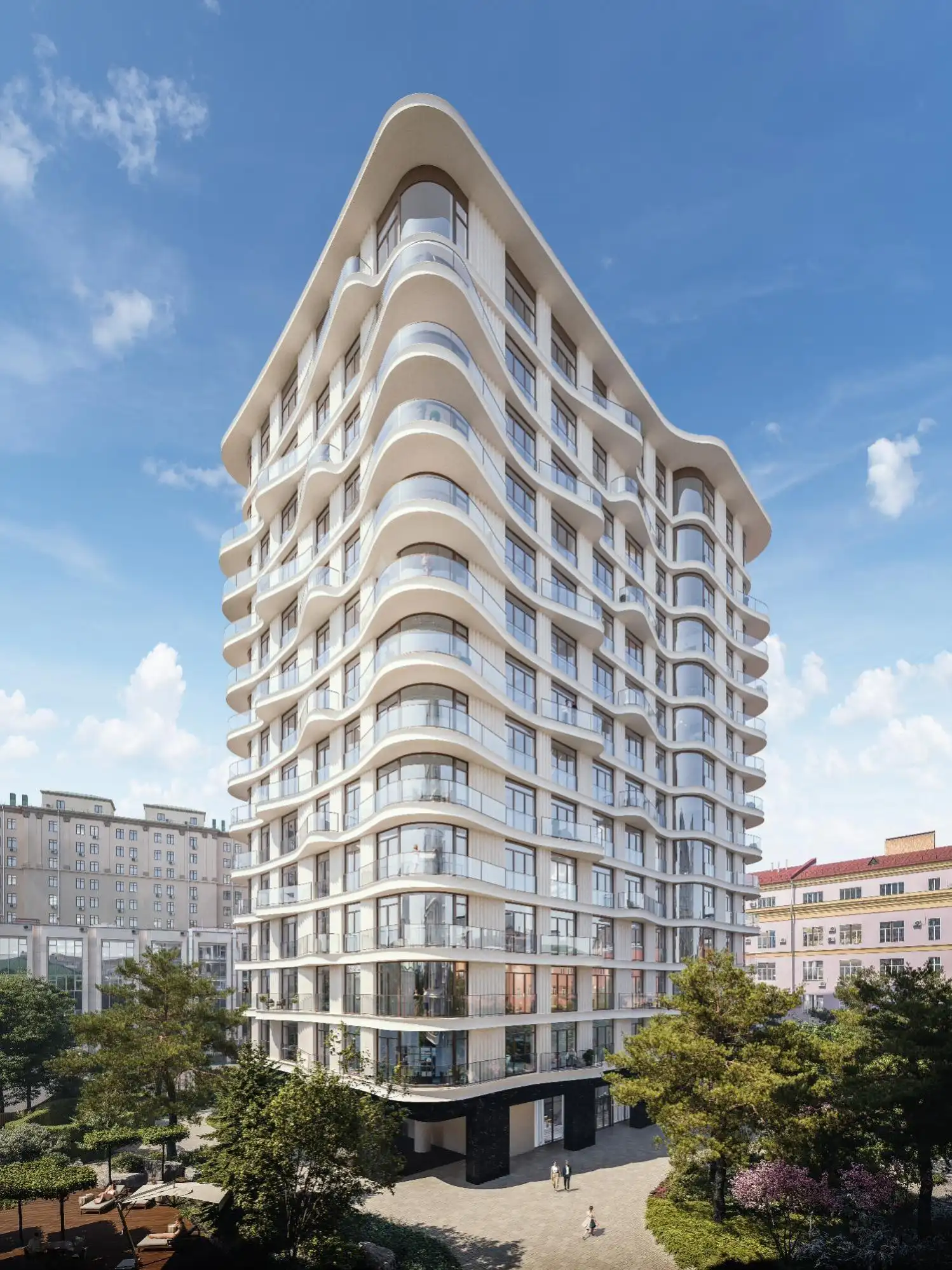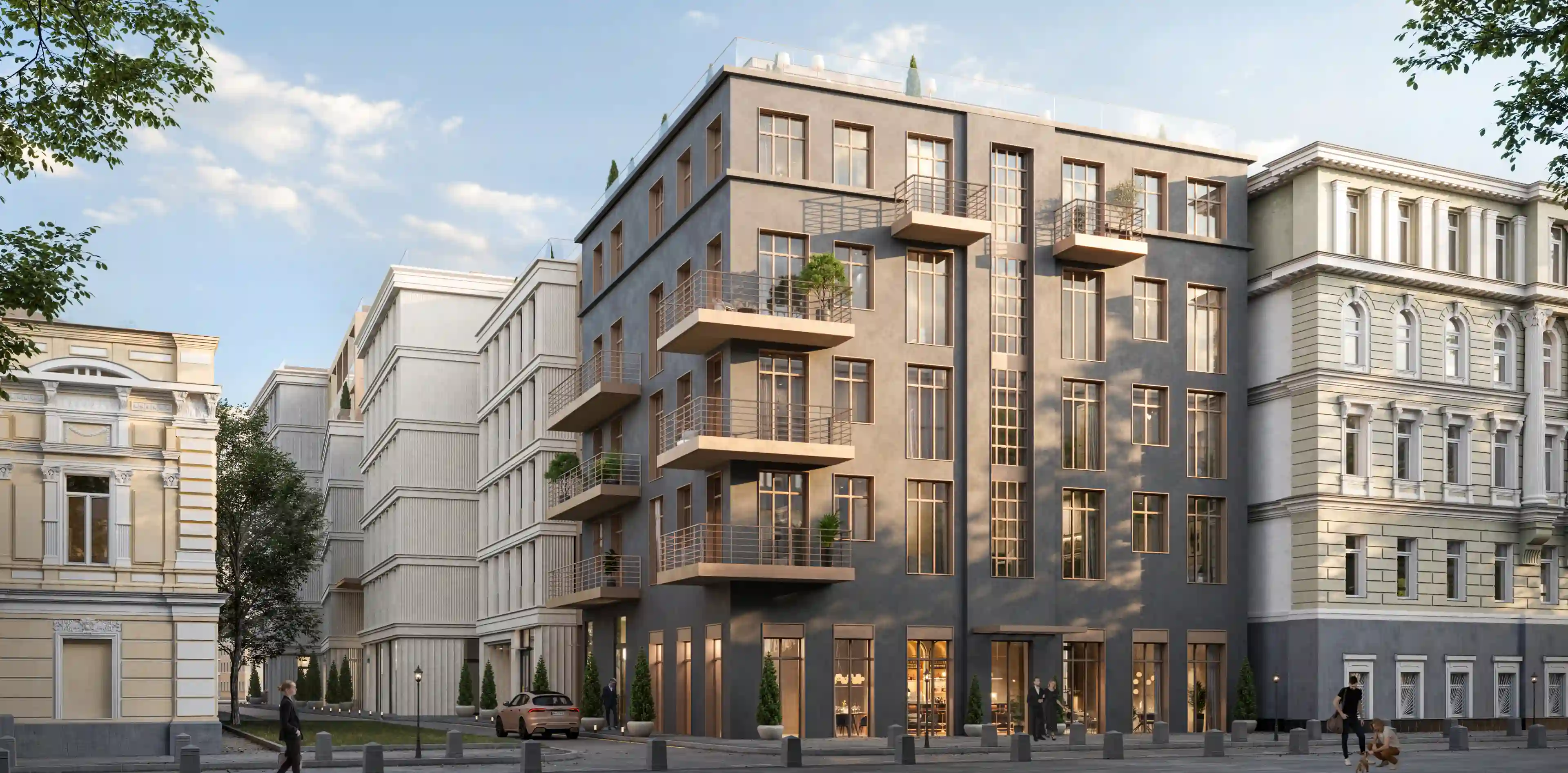 В доме 46 лотов, включая квартиры с французскими балконами открытого типа, варианты с тремя спальнями и панорамным остеклением, форматы с мастер-спальнями, а также три пентхауса с отдельной входной группой, террасами и высокими потолками до 4,65 м