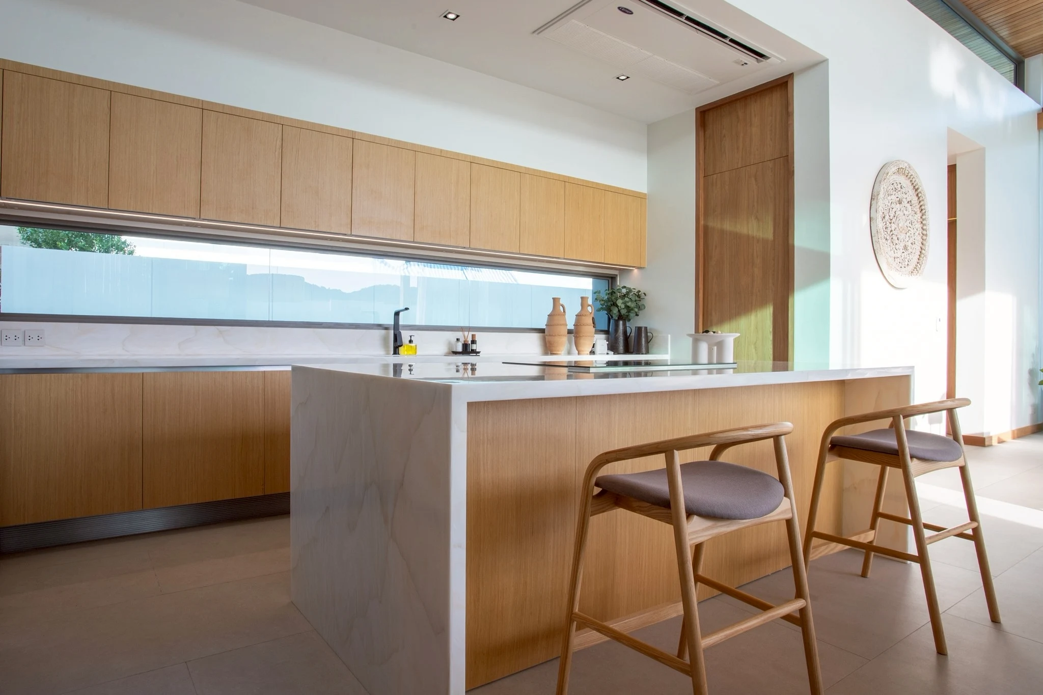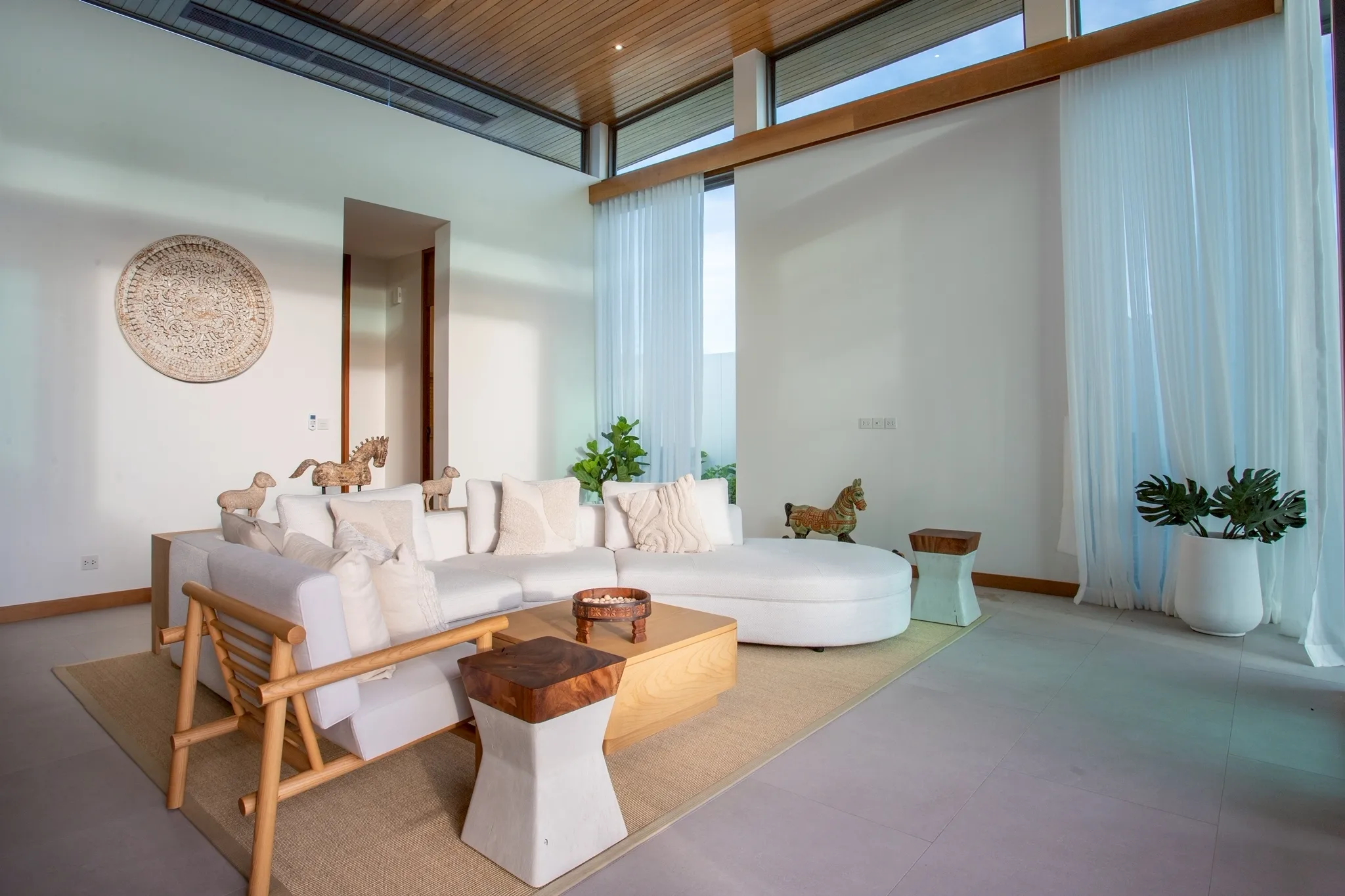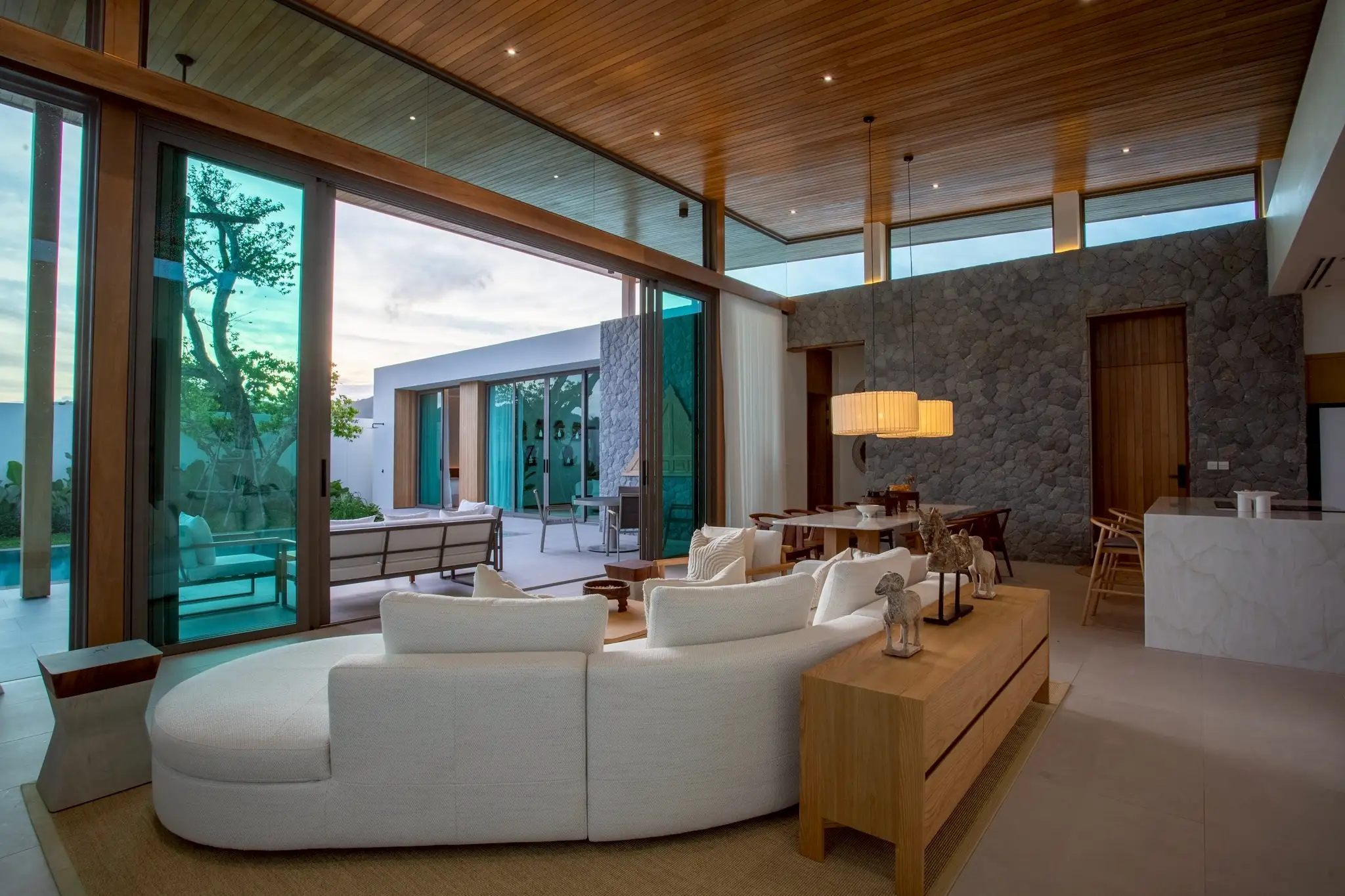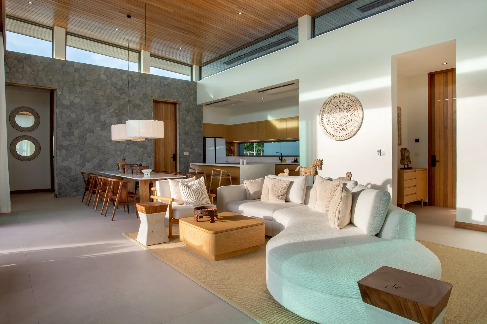 Внутри виллы высокие потолки и открытая планировка в столовой