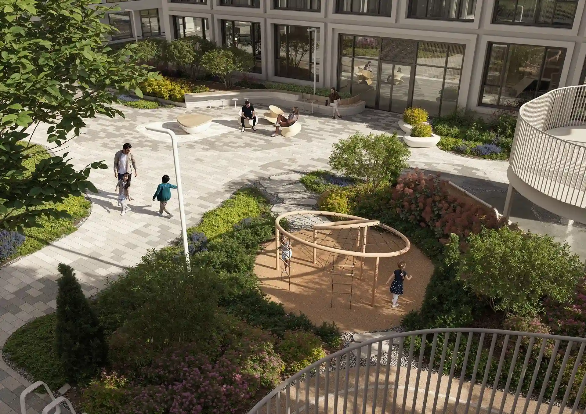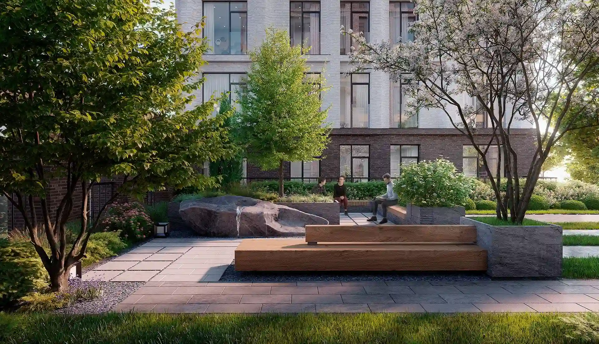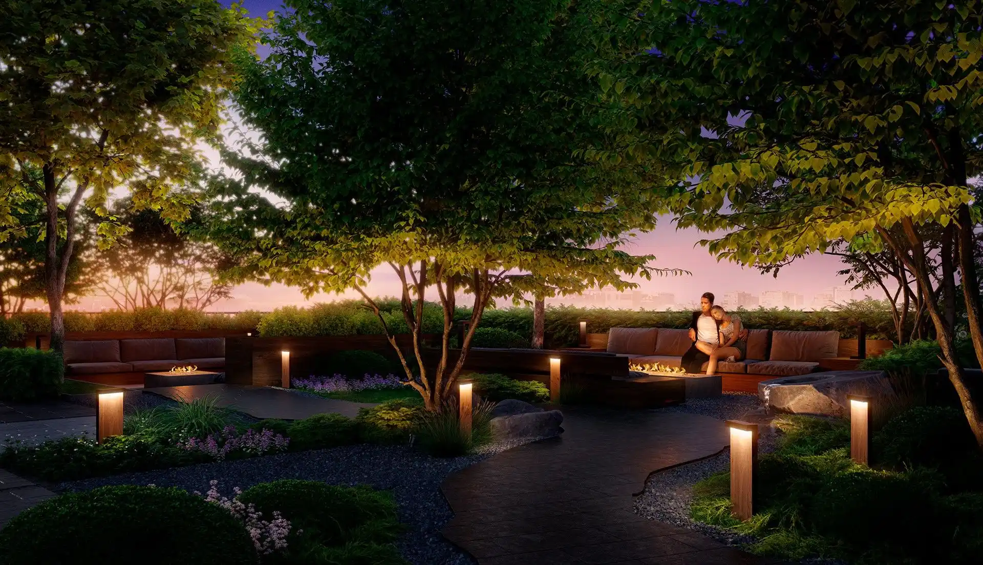 Особенность квартала — биокамины во дворе. Они позволят наслаждаться теплыми вечерами на свежем воздухе. А для большего комфорта предусмотрены подогреваемые лавки, что делает пребывание на улице приятным в любое время года.