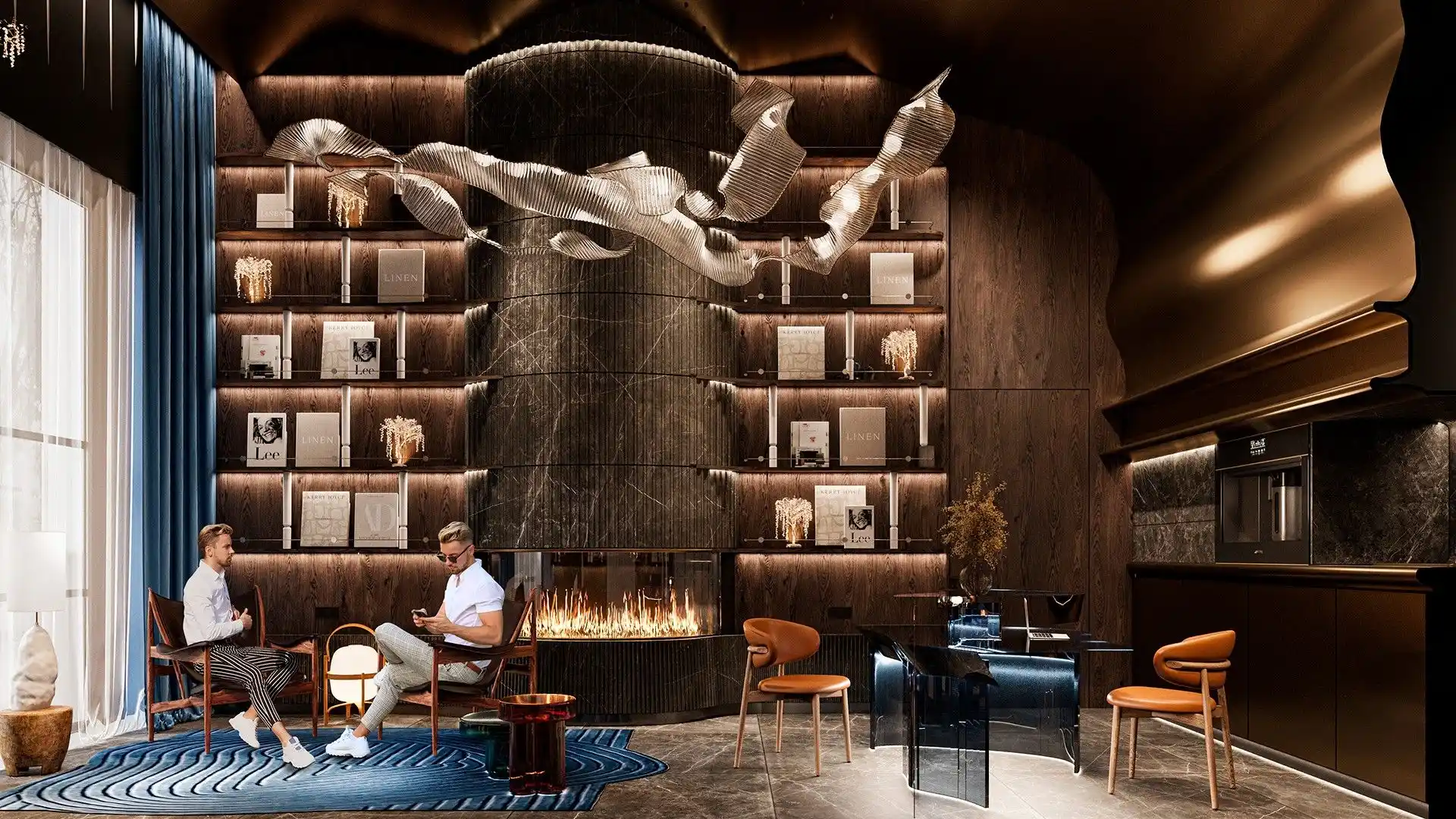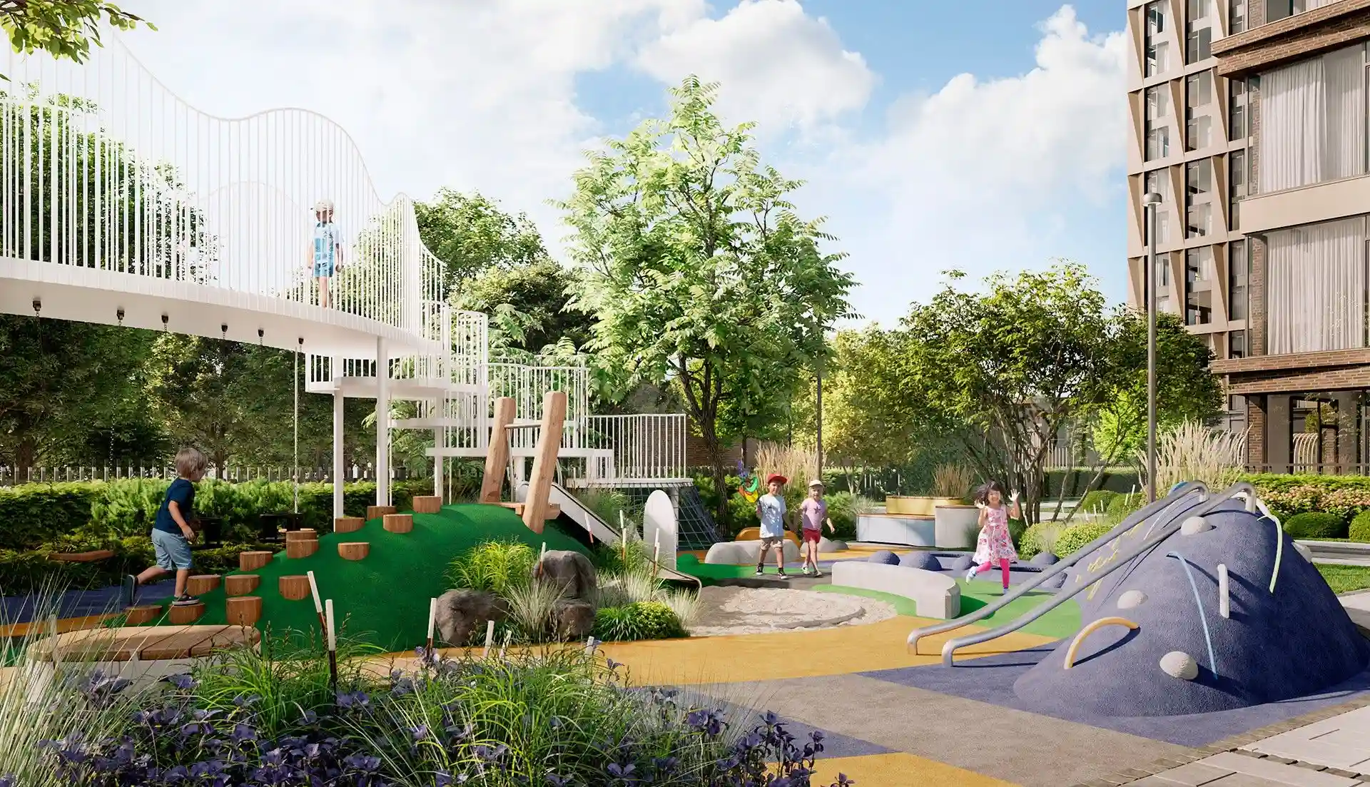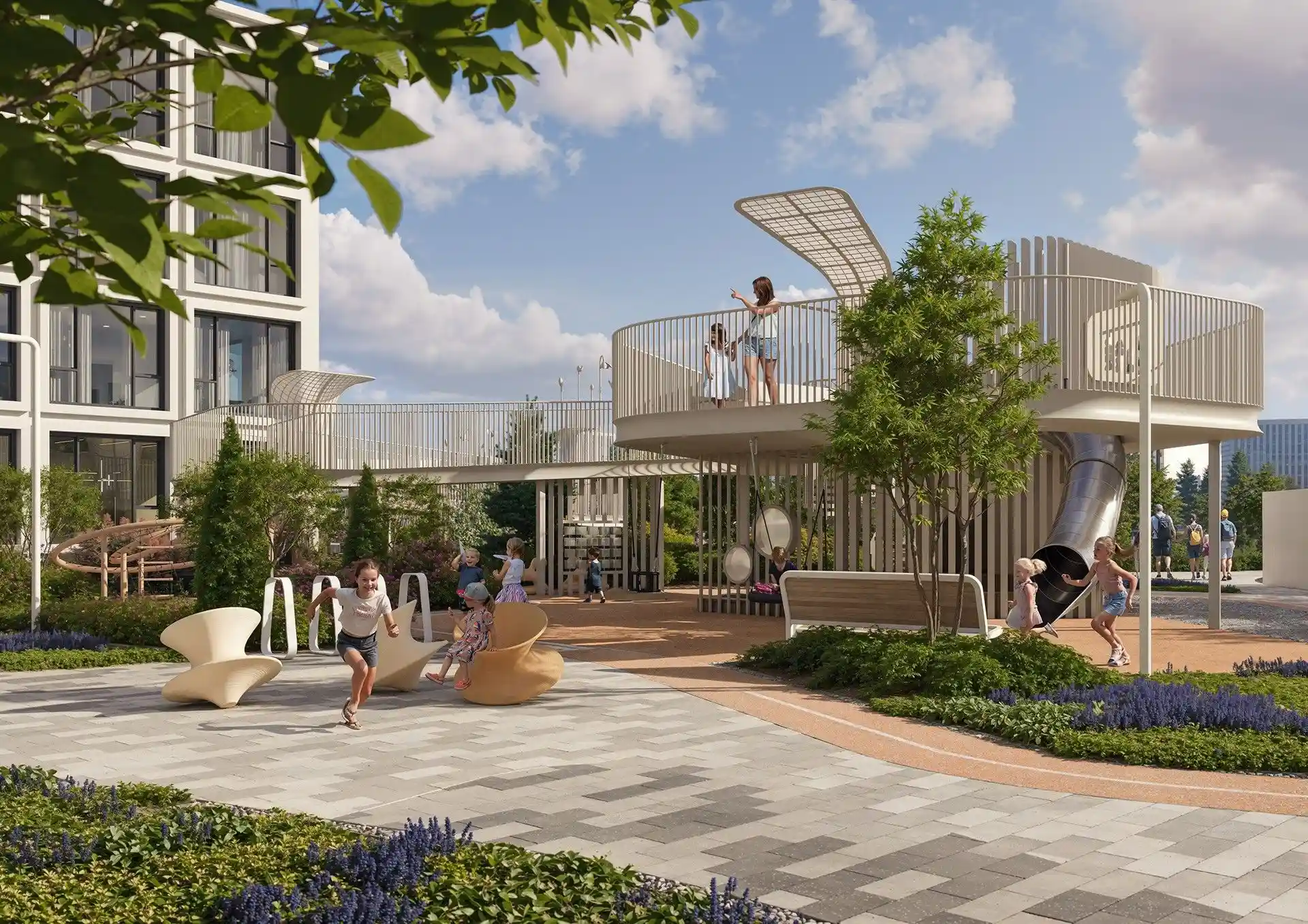 Особенность квартала — биокамины во дворе. Они позволят наслаждаться теплыми вечерами на свежем воздухе. А для большего комфорта предусмотрены подогреваемые лавки, что делает пребывание на улице приятным в любое время года.