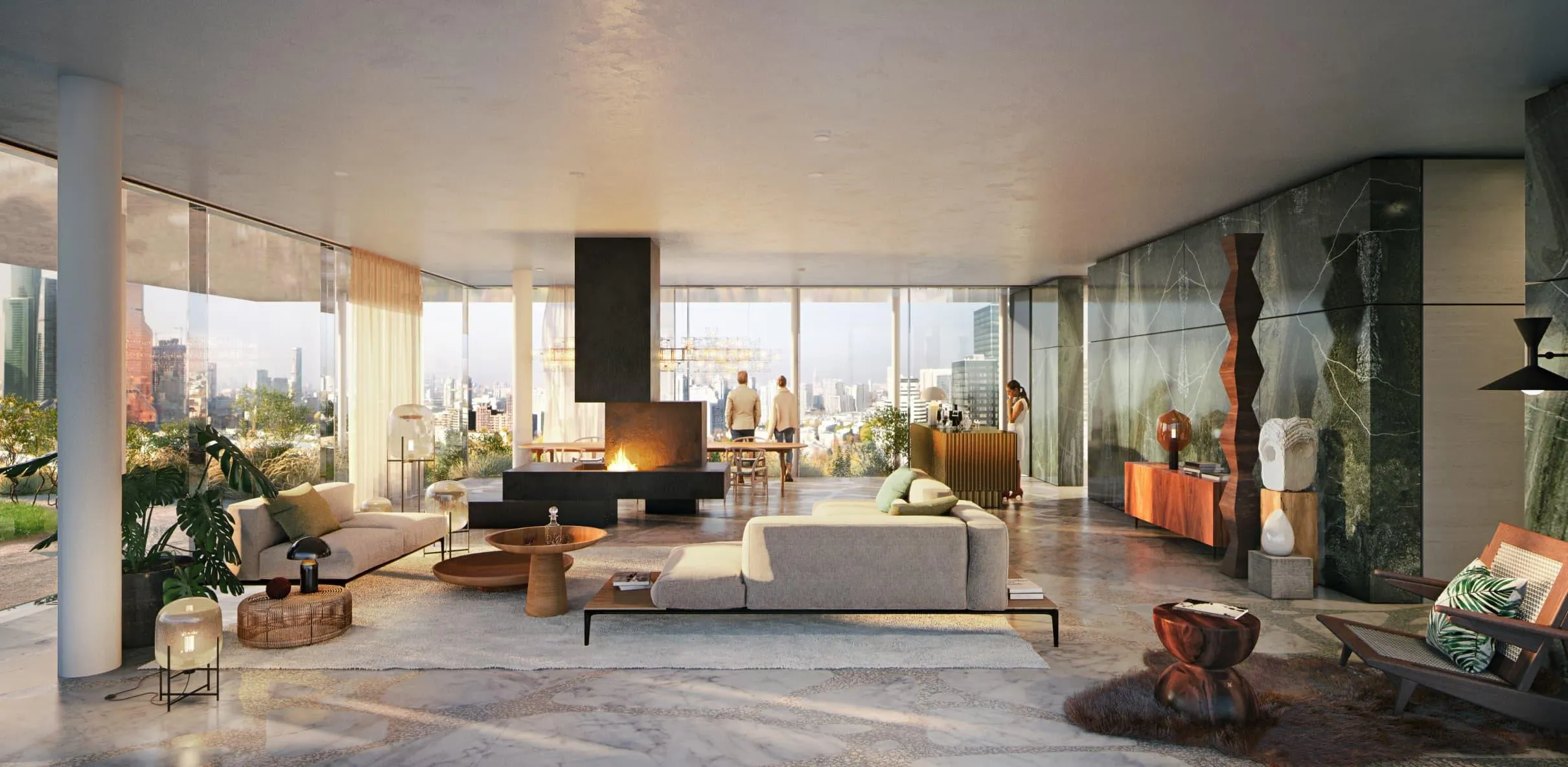 На последнем этаже расположены 7 «Небесных вилл» площадью от 837 до 974 м², которые оборудованы каминами, панорамными саунами, остеклением и приватными садами
