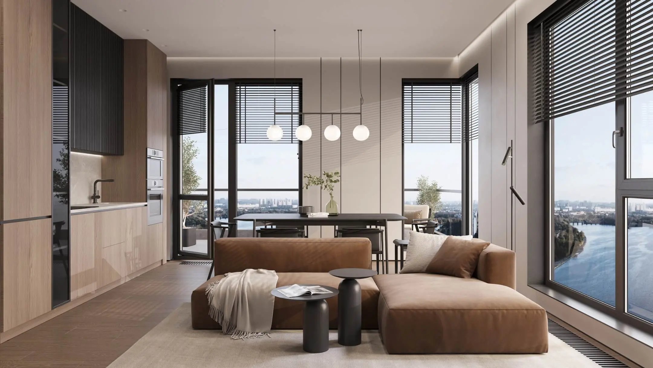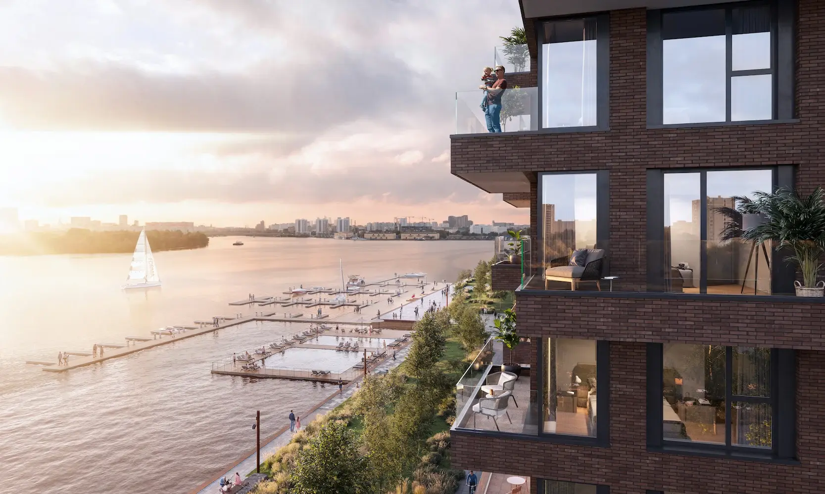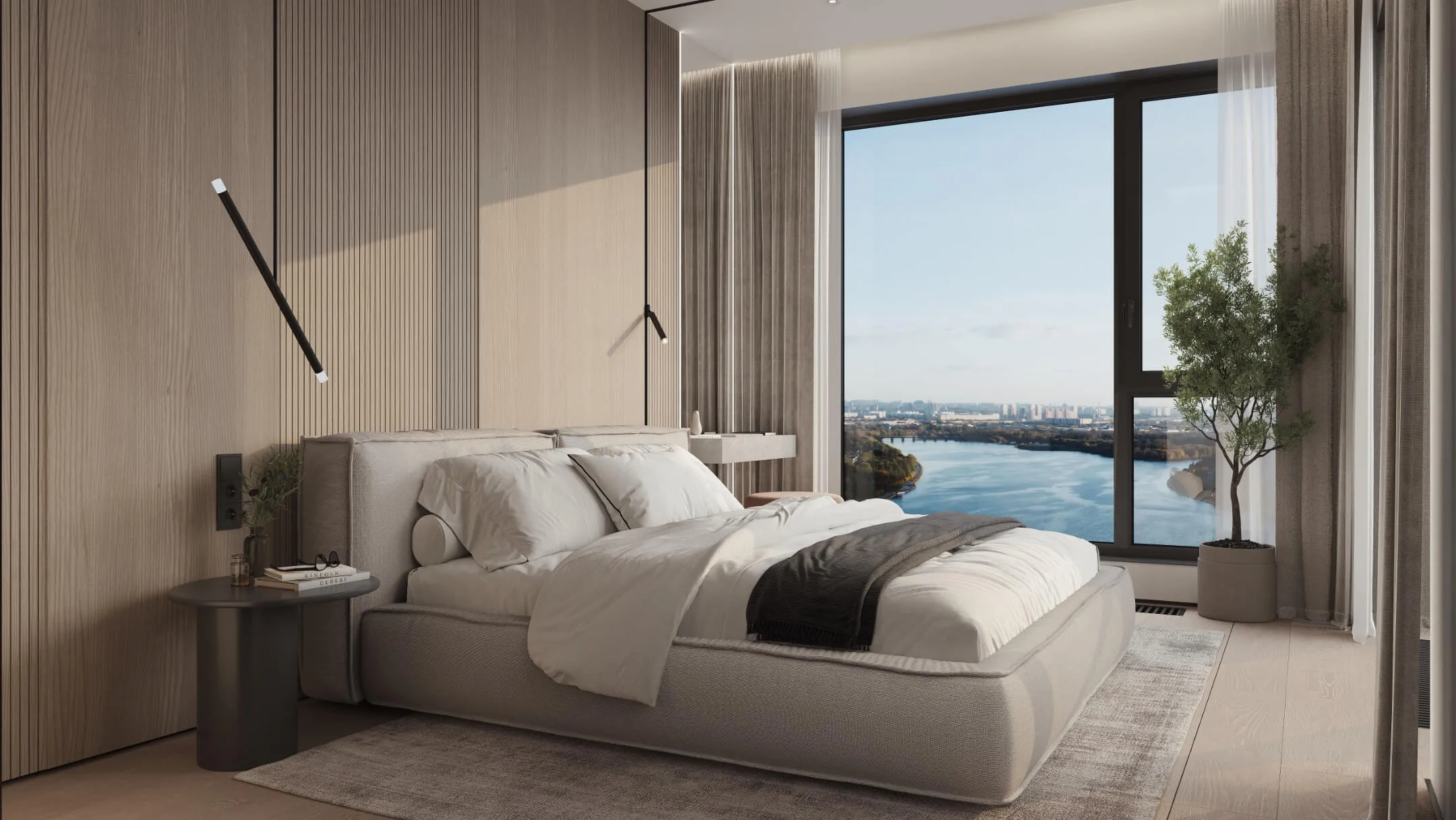 Из 95% апартаментов открываются панорамы на озеро Бобровое, водные пространства и современные кварталы противоположного берега, а также живописные закаты