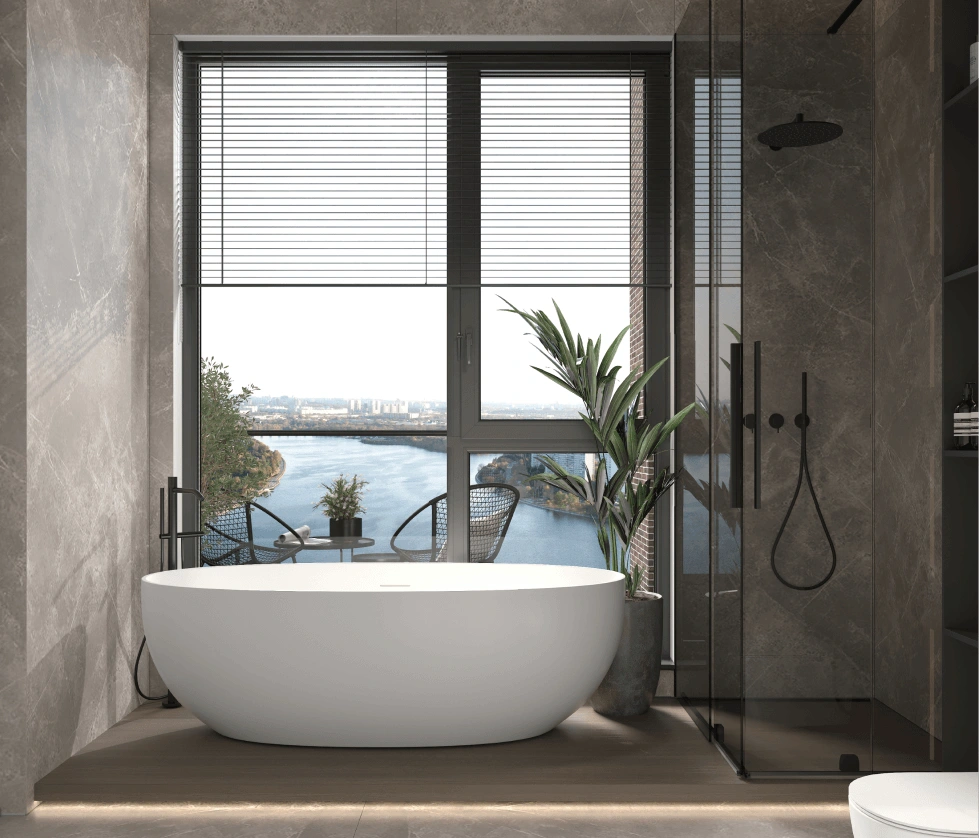 Представлены квартиры с панорамными окнами в ванных комнатах, гардеробными, мастер-спальнями и угловым остеклением