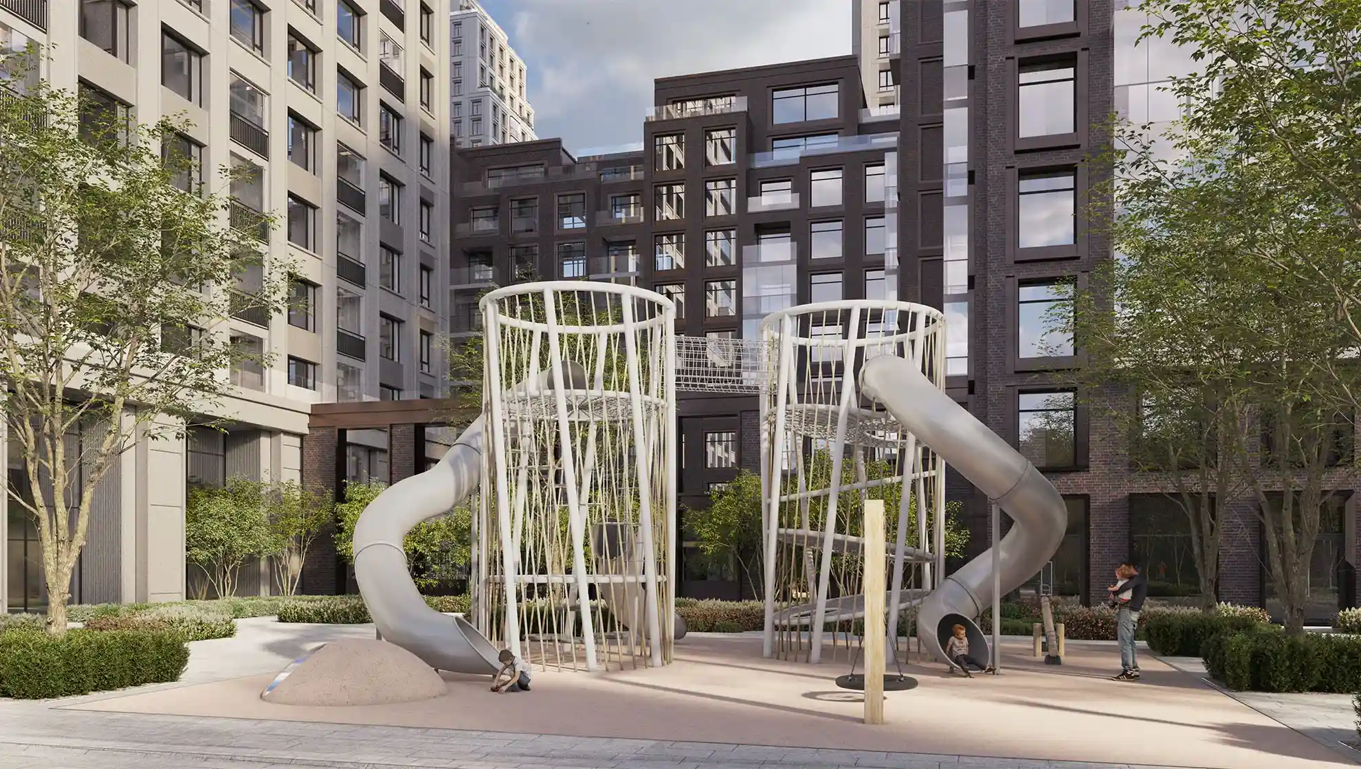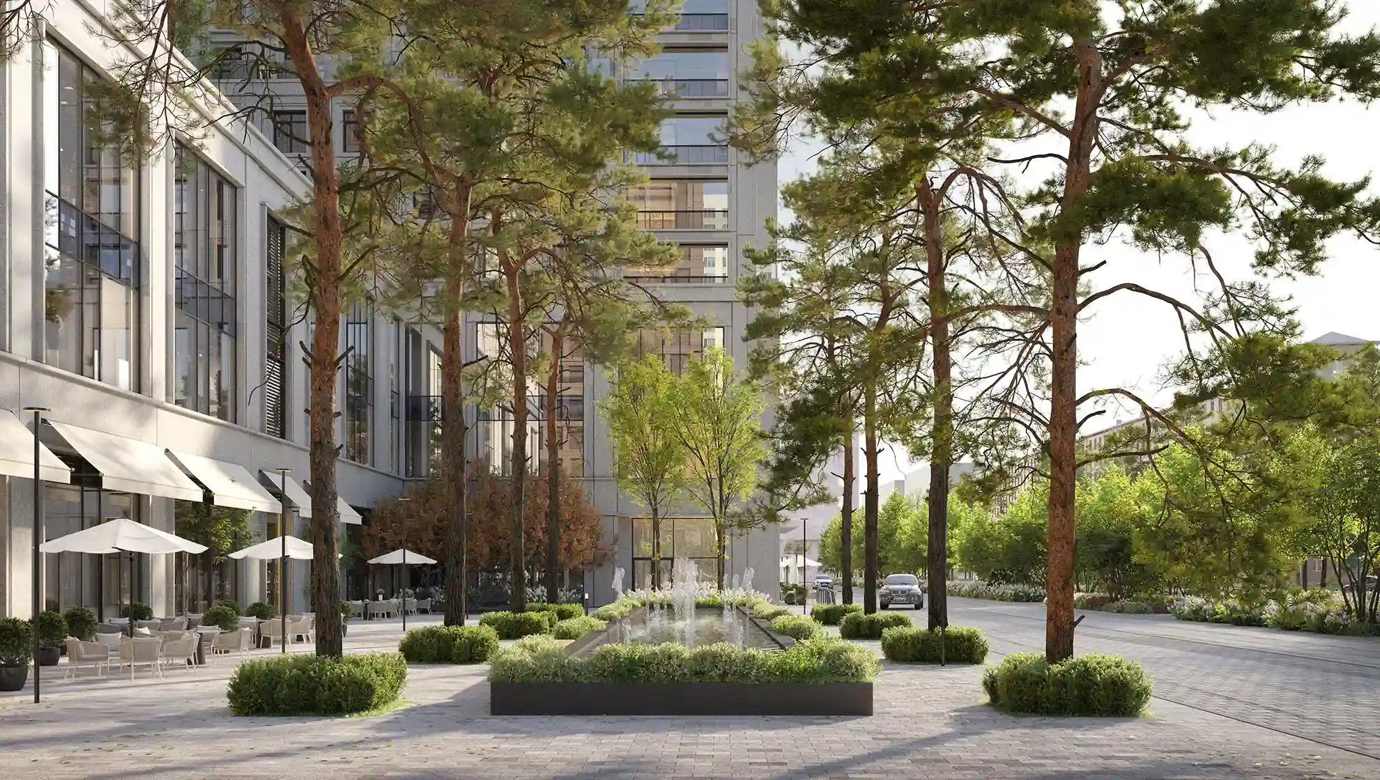 Центральная площадь между корпусами станет общественным пространством с арт-объектами, сухим фонтаном, зонами отдыха и площадкой для проведения мероприятий.