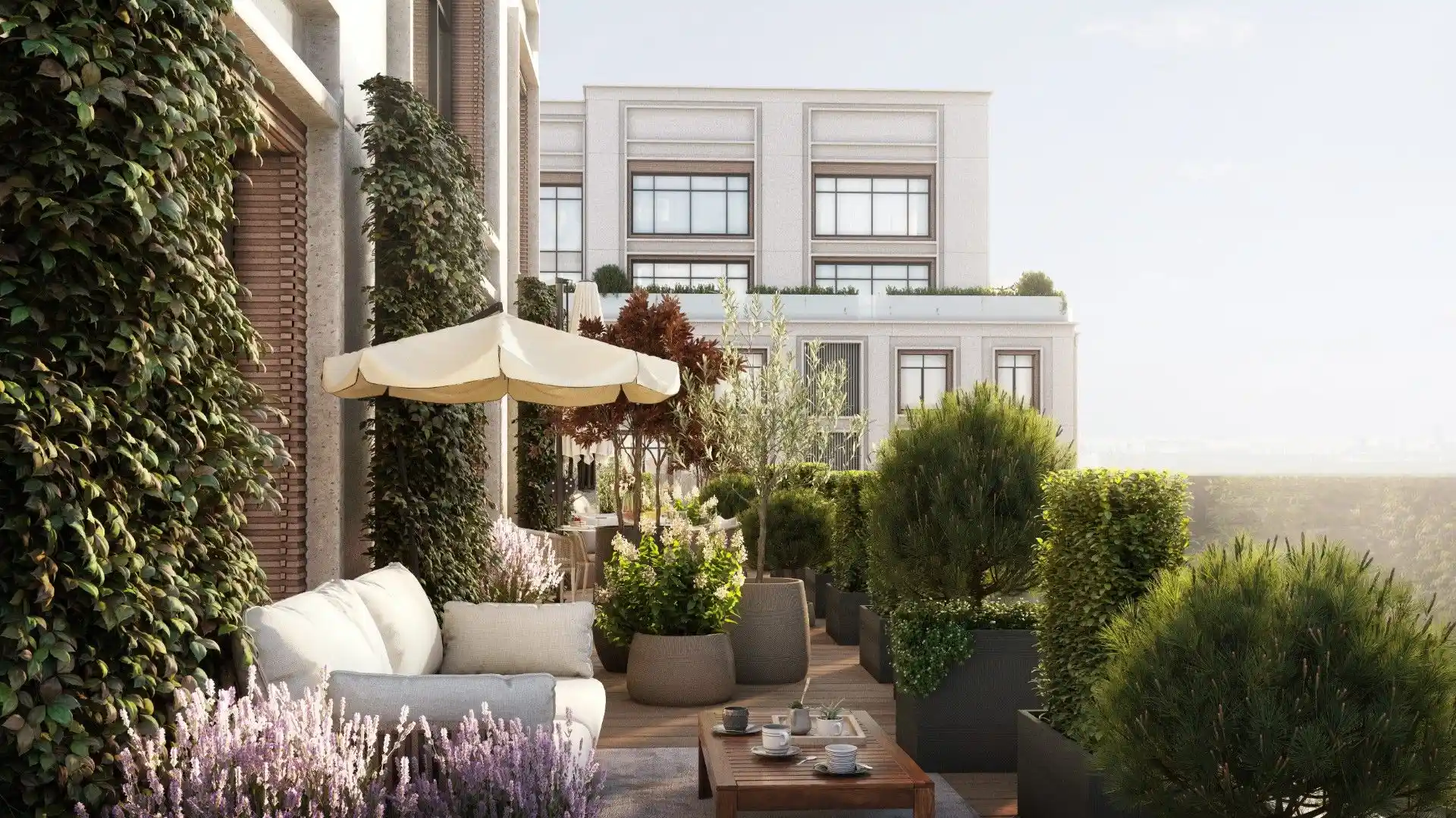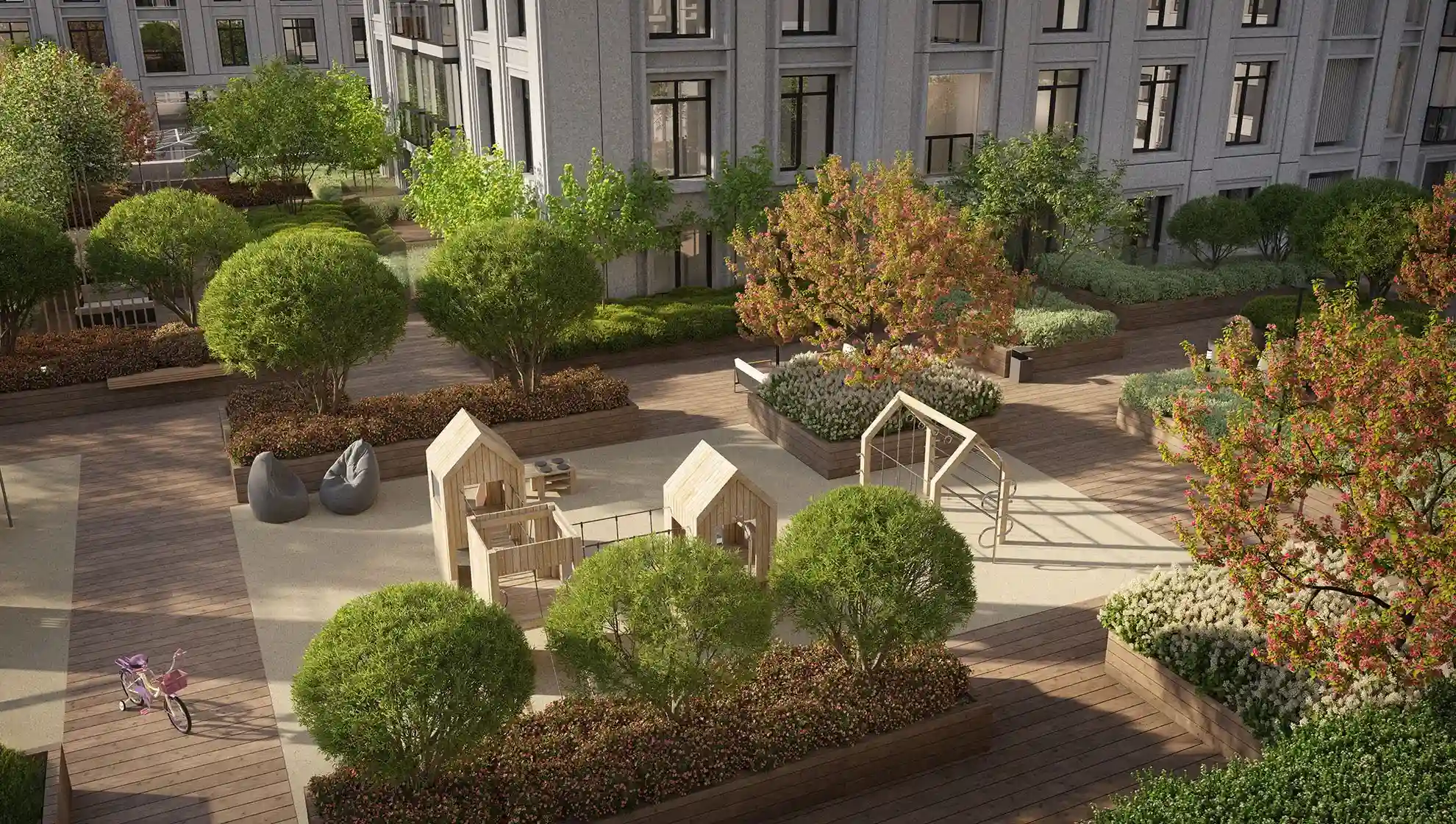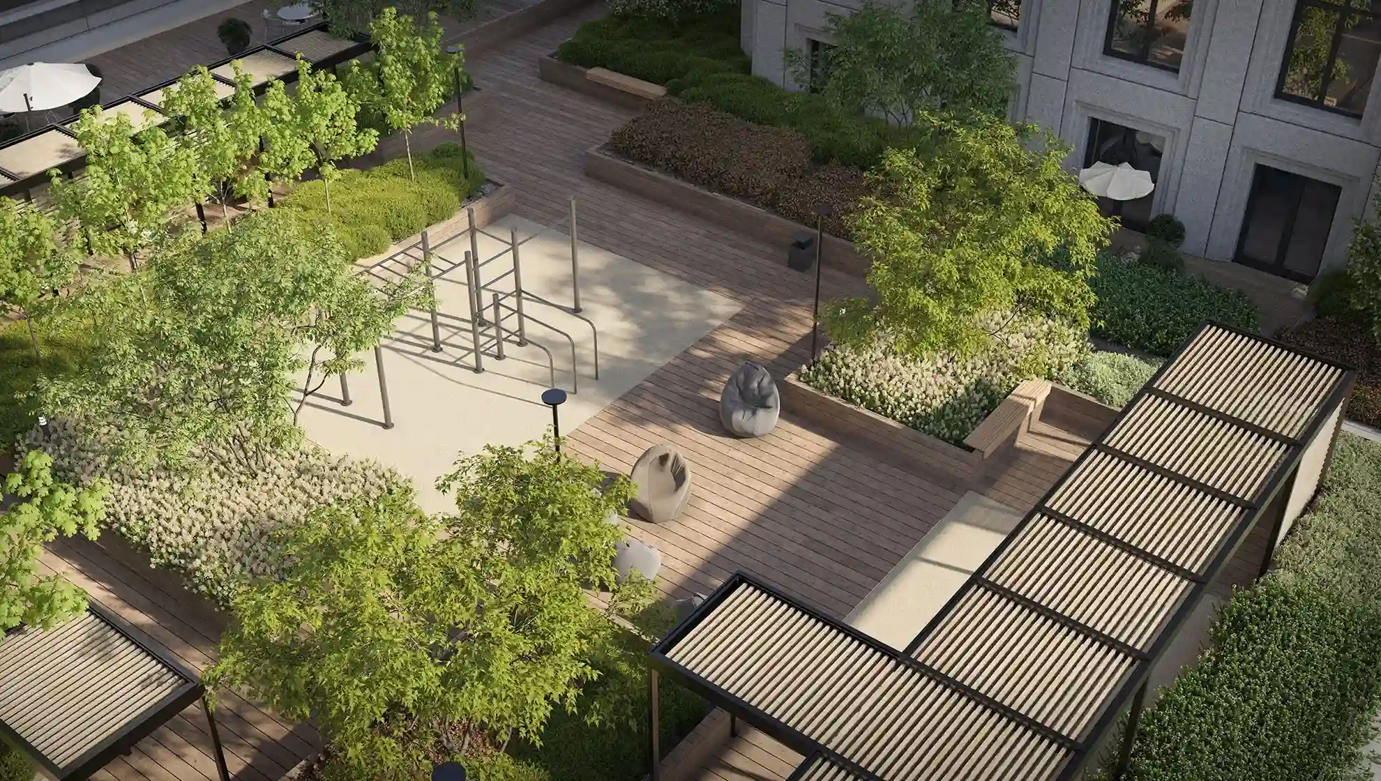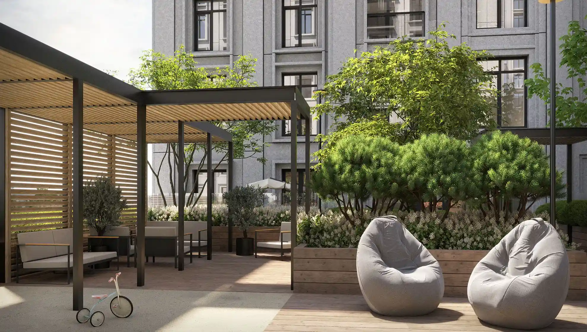 Для владельцев недвижимости в первой очереди на крыше торгово-развлекательного центра обустроен приватный двор-сад.