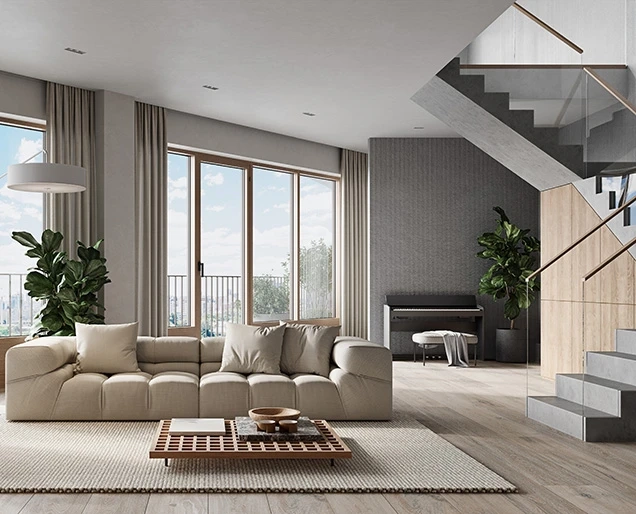 Типовые апартаменты оснащены панорамными окнами, а двухуровневые — витражным остеклением